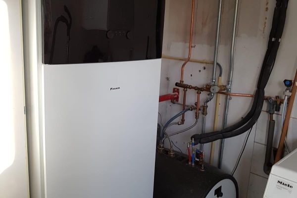 Combinatie van een lucht-water warmtepomp van 8 kW met vloerverwarming in de keuken en de badkamer en verder traditionele radiatoren in de overige ruimtes (kamer, slaapkamers, werkkamer). Verder een Finnoven kachel in de kamer (ongeveer 3 kuub) die bij temperaturen tot ongeveer nul graden slechts één keer per dag een uur brandt om vervolgens 24 uur voldoende warmte af te geven voor de kamer. Als het onder nul is, zal de kachel soms 2x per dag van een curver box hout voorzien moeten worden. Deze Finnoven wordt vanaf oktober tot maart dagelijks gestookt. De warmtepomp zorgt voor de overige benodigde warmte en de warm water voorziening (180 liter vat). Daarbij wordt ook nog gebruik gemaakt van 2 zonnecollectoren in combinatie met een 100 liter vat voor warm water. Voor het koken wordt gebruik gemaakt van een elektrische (halogeen) kookplaat.