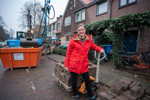 Maar ook dat de keuze voor een niet-luchtwarmtepomp ook een apparaat op het dak of in de tuin zou schelen. En als laatste dat de koeling die een grondgebonden warmtepomp je geeft lekker passief is, en dus niet veel stroom kost. Het lastige was wel dat die buizen voor de warmtepomp 130 meter de grond in moeten. Kan niet – want te dicht op de gevel; kan niet – want boorder komt niet in achtertuin; kan niet – te kostbaar. Dat laatste bepaalde ik toch zeker zelf wel. En uiteindelijk vond de aannemer een partner in de installateur die zei dat ze dat wél konden uitvoeren, gewoon in de voortuin die 3 meter diep is. Dus gaan met die banaan. Maar toen bleek dat de boorder heel druk was, werd het nog even spannend. Uiteindelijk kwam de planning wel rond, de laatste week voor de kerstvakantie was wel haalbaar. En dat ging dus helemaal lukken met de start net na de herfstvakantie.
