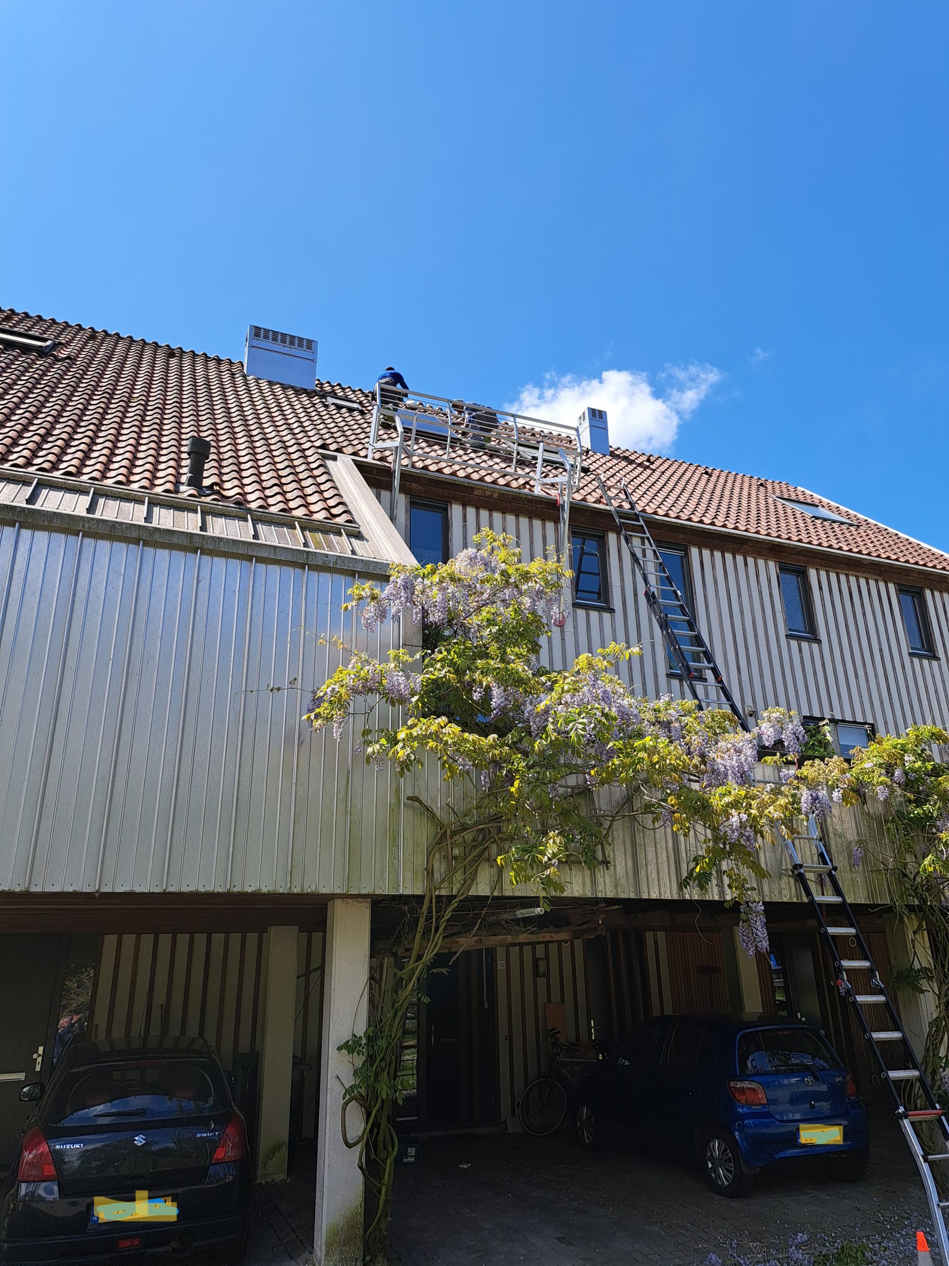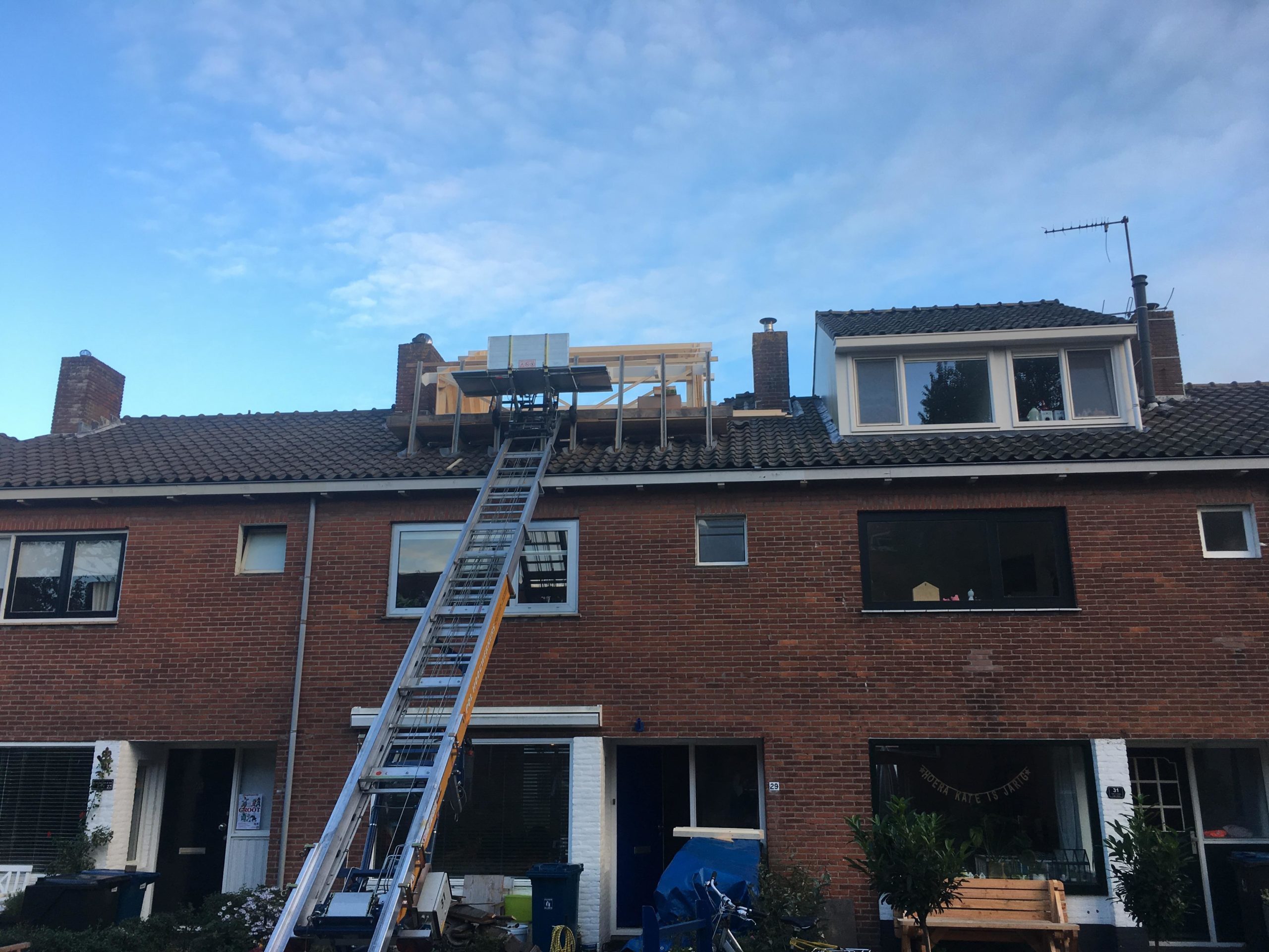 Een nieuw dak De vorige bewoonster had een jaarverbruik van bijna 4000 m³ gas. Er werd met gaskachels gestookt en het was slecht geïsoleerd. Isolatie was dan ook de eerste stap voor Arjen om de energiekosten te verlagen. ‘’De eerste termijn van dat jaar was nog wel hoog, maar daarna kelderde dit”, vertelt hij. Het houten dak verving Arjen in 2001 voor een nieuwe met staalconstructie en dakisolatie. ‘’Het dak is ergens anders gebouwd en als geheel op de woning geplaatst. Daarna zijn de dakpannen erop gekomen.’’