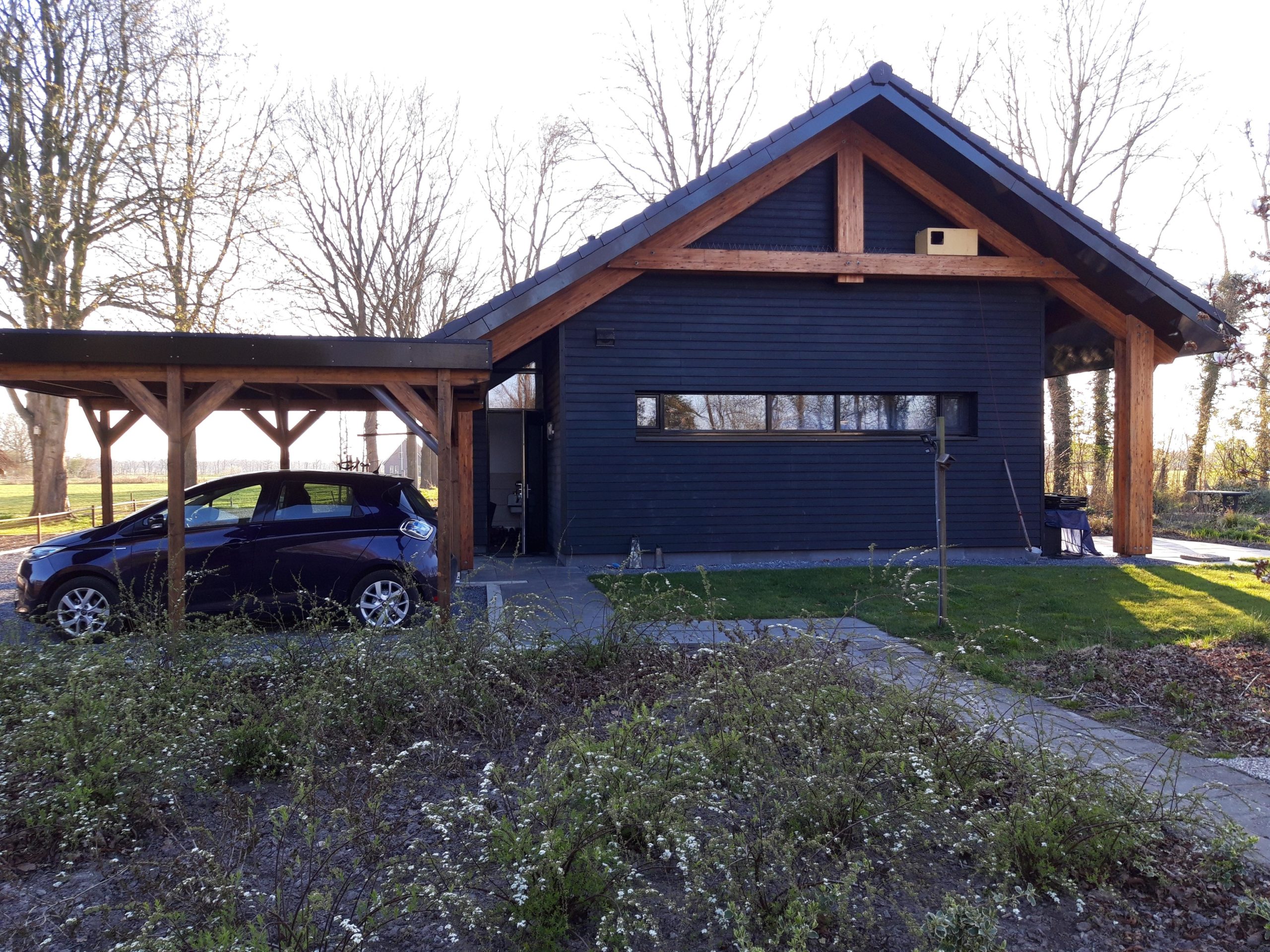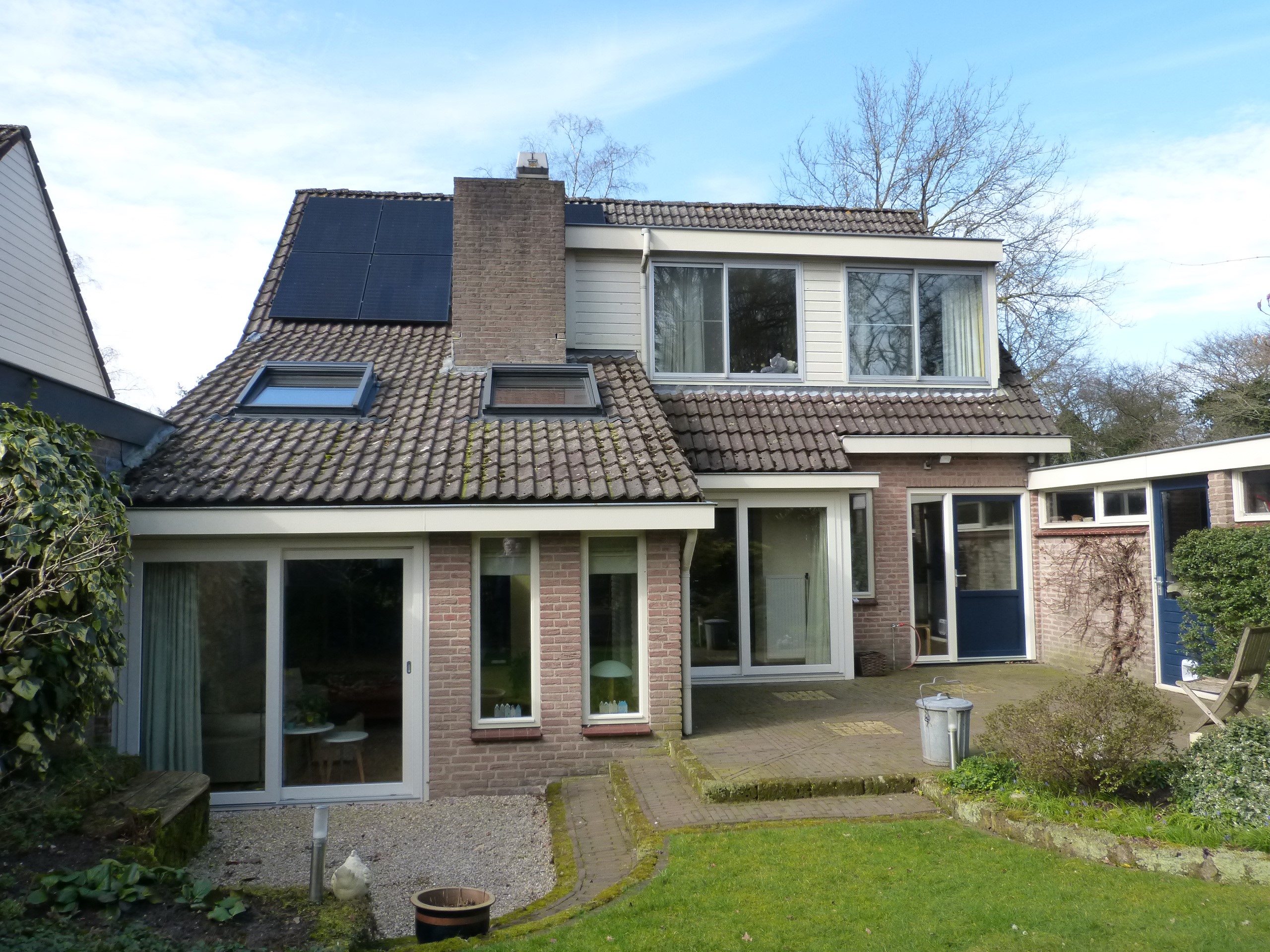 Het huis is daarnaast voorzien van 12 zonnepanelen in oost-west opstelling en een inductiekookplaat. Om de stroomopbrengst over de dag te verspreiden is in de meterkast 3-fase wisselspanning aangelegd. “En als voorlopig sluitstuk hebben we een zuinige (gebruikte) elektrische personenauto gekocht met een relatief kleine batterij”, zegt René.