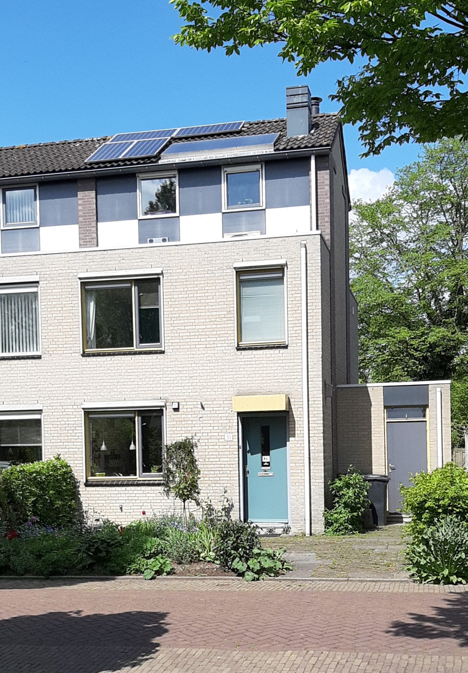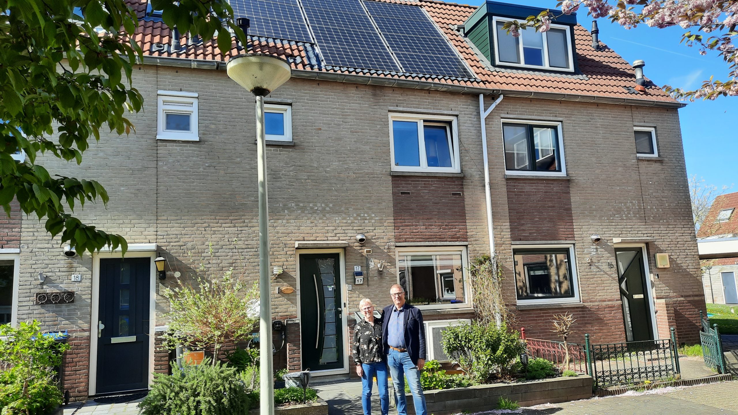 Deze tussenwoning is in 2016 verduurzaamd tot een nul-op-de-meterwoning. De huiseigenaar heeft onder andere een lucht/water warmtepomp in combinatie met vloerverwarming laten installeren en de woning heeft 14 zonnepanelen.