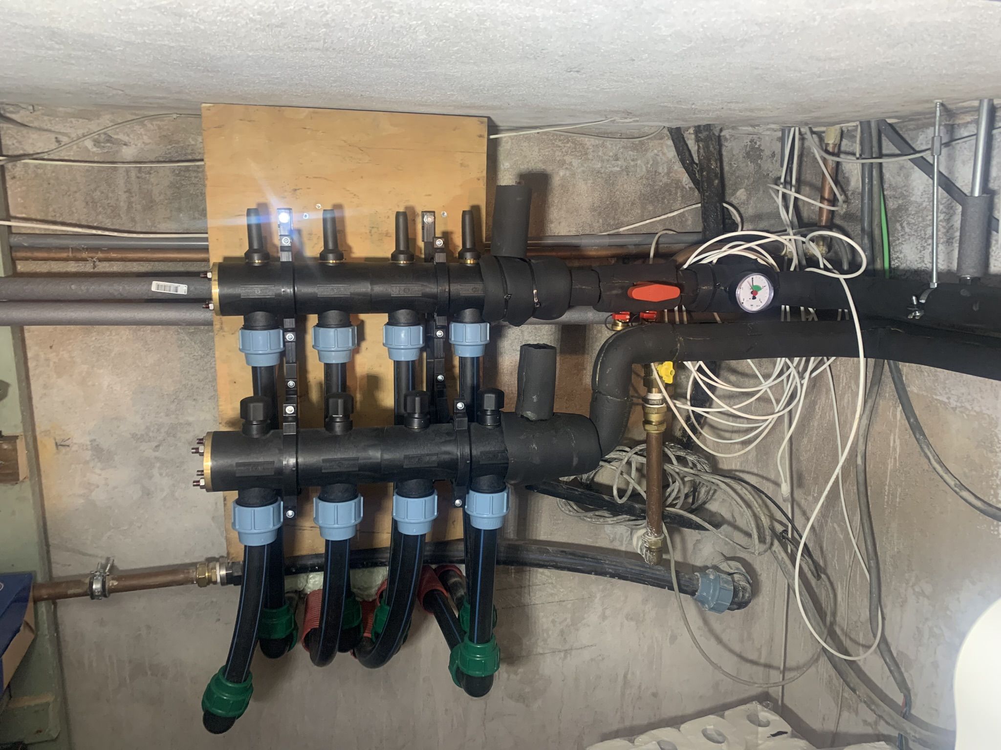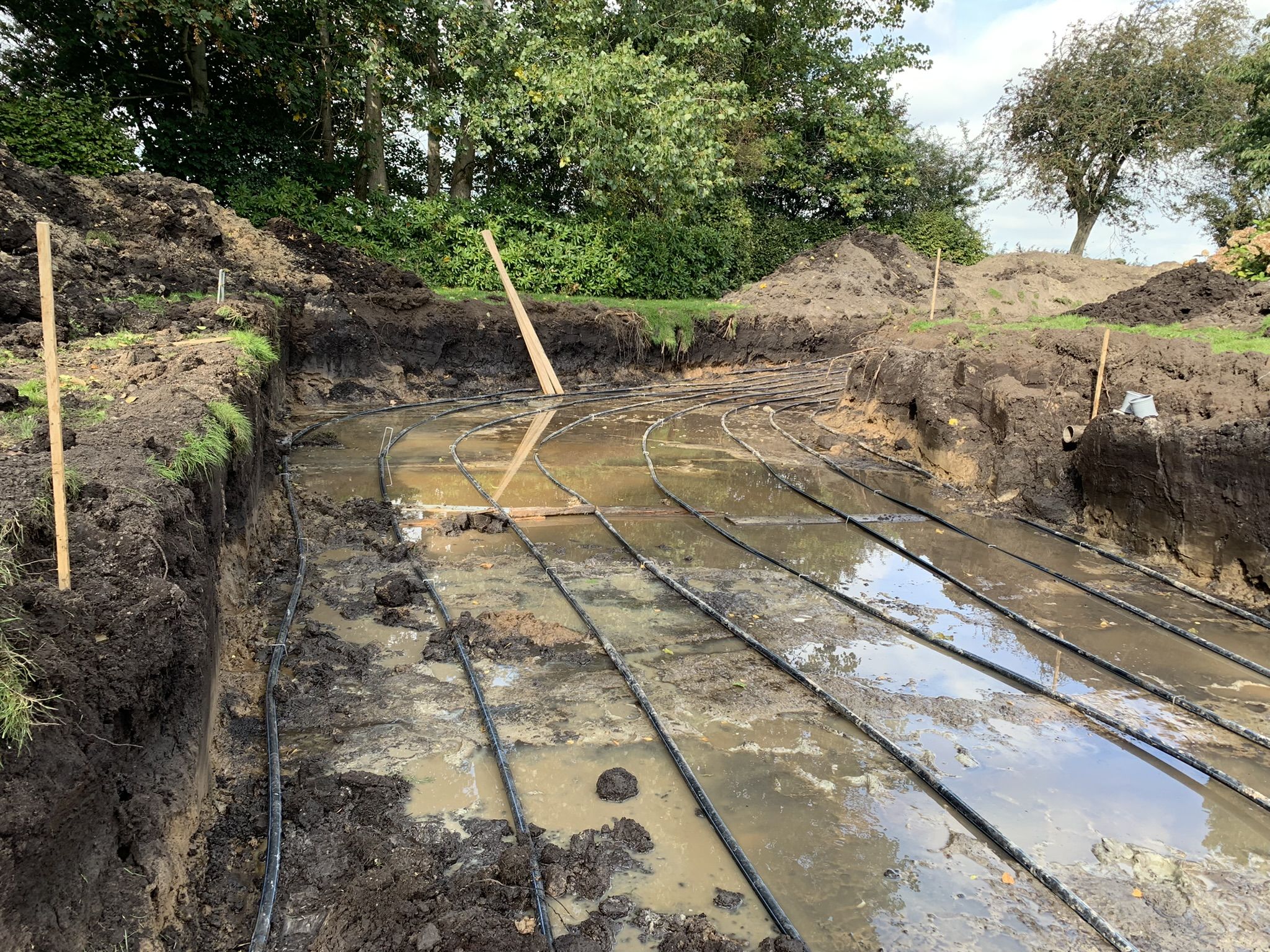 Bodemwarmtepomp met horizontale slangen. Ingegraven op circa 1,5 m diep zodat in de zomer deze ook in het grondwater liggen. Ik wil er ook passief mee gaan koelen. Ik heb 4 groepen gemaakt van circa 110 m verspreidt over 600 m2. Vrij ruim maar ik heb ik heb ook de ruimte. Ik wil de bron zo warm mogelijk houden voor een beter COP.