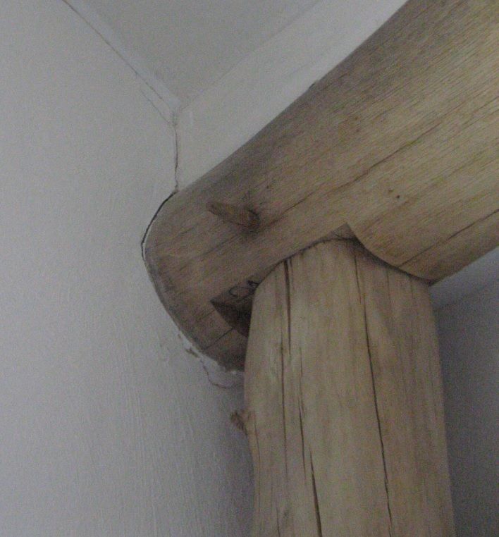 Het aansluiten van dakliggers en afwerkende plaatmaterialen op rondhout heeft heel veel extra uren gekost (lees: hogere kosten met zich meegebracht). Bovendien bevat onbewerkt rondhout alle spinthout en daar is met name de bruine spinthoutkever (lyctus bruneus) verzot op. Deze beestjes maken dezelfde gaatjes als houtworm maar hebben een levernscyclus van slechts 3 maanden tegenover 3 jaar voor de houtworm. Een vrouwtje legt gemiddeld 500 eitjes. Resultaat heel veel beestjes en houtstof. Na drie behandelingen van het hout zijn we nu voor 99,9% verlost van deze beestjes. Als we dit alles van tevoren hadden geweten hadden we vierkant gezaagd eikenhout gebruikt. We hadden ons ingesteld op breedtekrimp (8%) en het werken van het hout. Dat valt eigenlijk wel mee. Met enige regelmaat horen we knallen waaruit kan worden opgemaakt dat het hout inderdaad werkt. Door het werken van het hout zijn er wat scheurtjes ontstaan in de aansluitende materialen. Het krimpen is aanzienlijk minder dan de 8% waarop we gerekend hadden. Er zou geen lengtekrimp zijn. In werkelijkheid is die 0,5%. Op een totale lengte van 15 meter is dat 7,5 cm, iets waarmee geen rekening is gehouden. Het verklaart voor een deel de knallen in het hout.