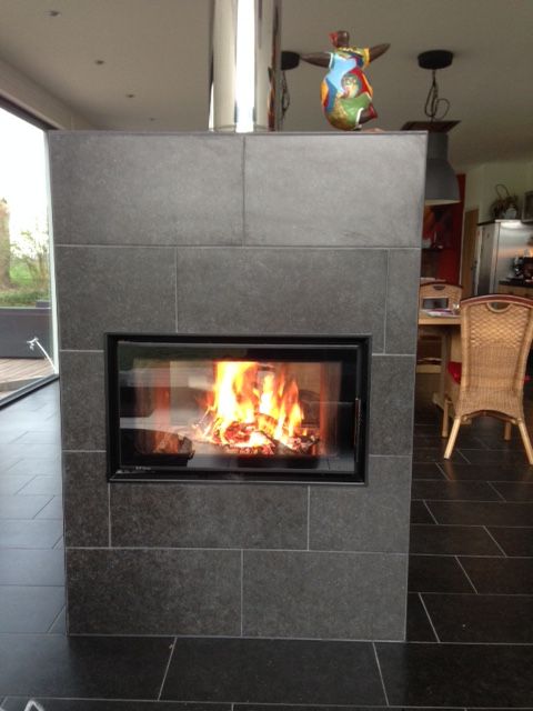 1/3 is stralingswarmte en 2/3 wordt warm CV-water wat naar de buffer gaat. Het is doorkijkhaard met aan beide kanten een deur. Deze heb ik met dubbelglas uitgevoerd dan krijg ik de meeste CV water wat ik door het hele huis kan gebruiken.