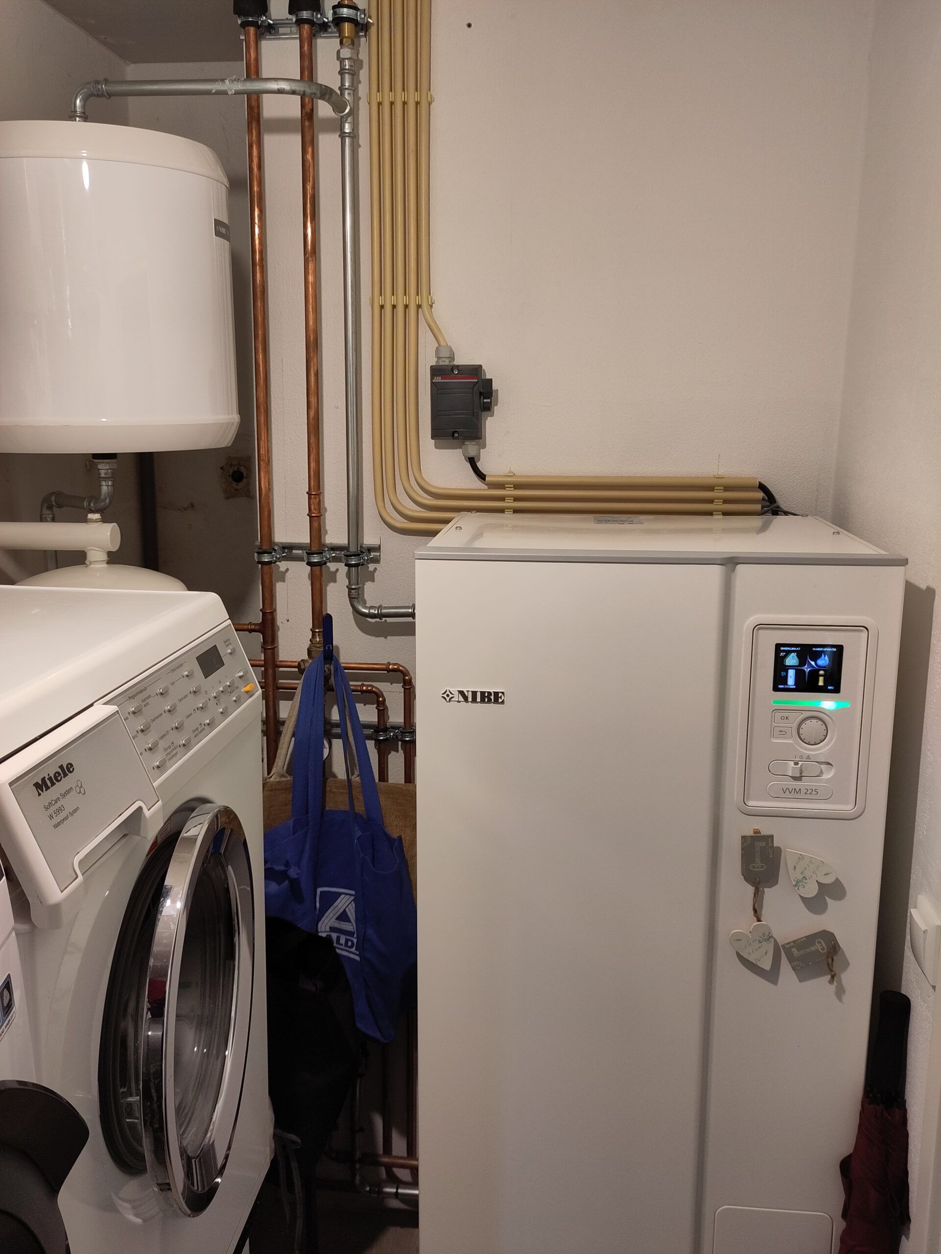 Nibe luchtwater warmtepompinstallatie, buitenunit F2040-6 op platdak en binnenunit VVM225 met geïntegreerde boiler (180 Ltr) in technische ruimte. Geïnstalleerd door Bakker Installatietechniek te Elburg.