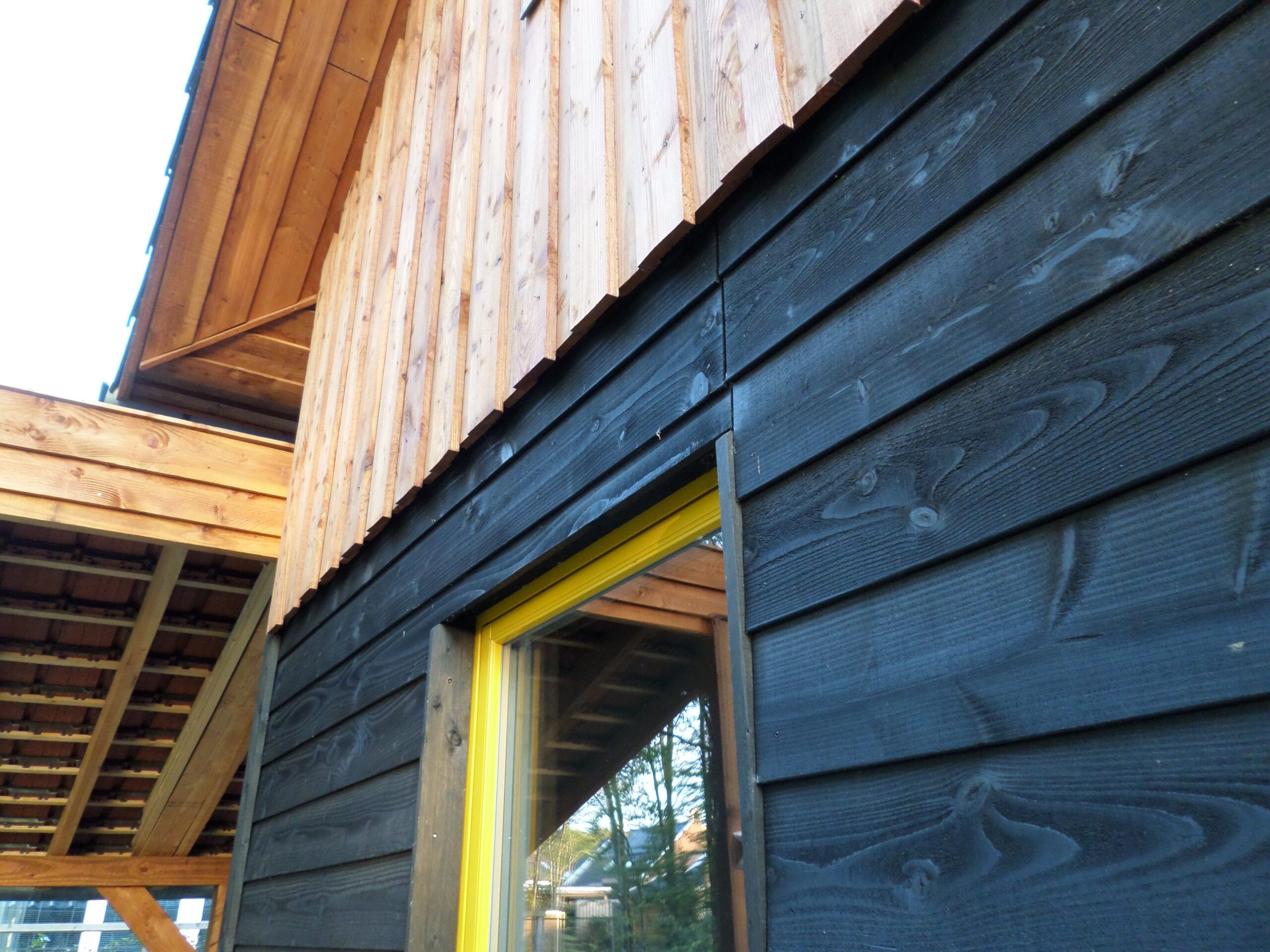 De houten bekleding aan de buitenkant van de woning is behandeld met een beits op basis van lijnolie.