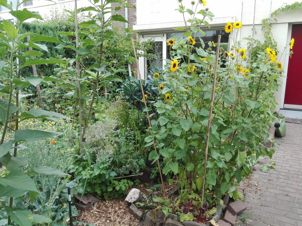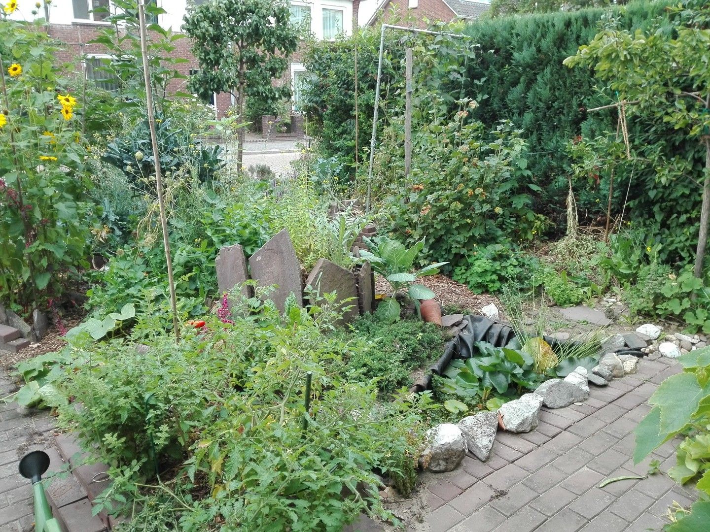 Sinds 2010 veranderde ik mijn voor- en achtertuin steeds meer in een moestuin. Veel fruitsoorten; rode bes, een pruimeboom, leipeer, appels, druiven, aardbeien, frambozen. Verder groentes: spinazuring, pastinaak, eeuwig moes, snijbiet, bonen en tomaten. Kruiden zoals rozemarijn, salie, oregano, citroenmelisse, munt, thijm. En waterkers in de vijver achter. Een compostplaats van gaas.