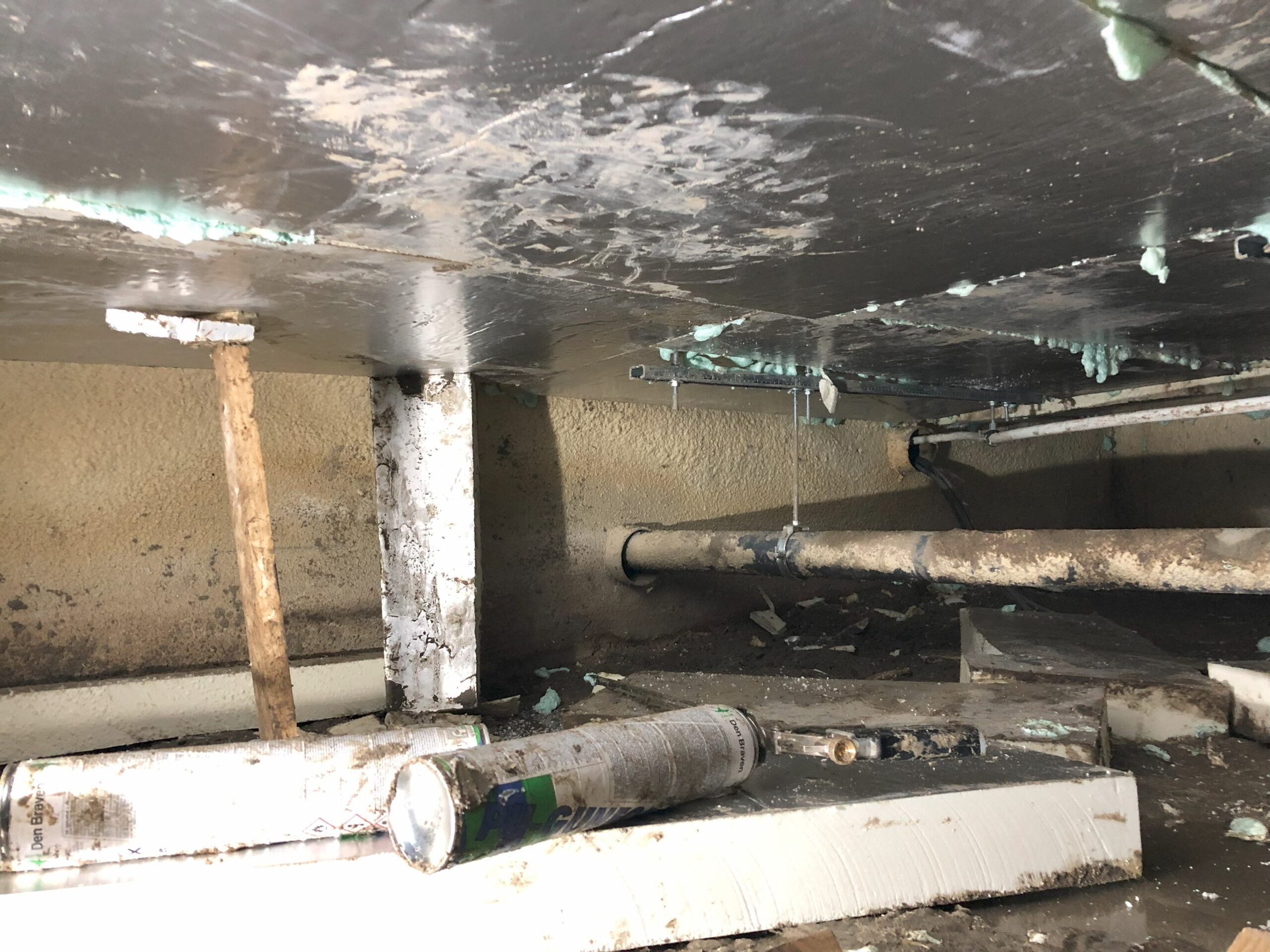 Het is een hele klus om de isolatieplaten in de kruipruimte te bevestigen. We hebben de platen met een tussenruimte van ongeveer een centimeter van elkaar met steuntjes tegen de vloer geduwd. Vervolgens met een PUR-pistool door de naden de platen tegen de vloer aan gelijmd met PUR.