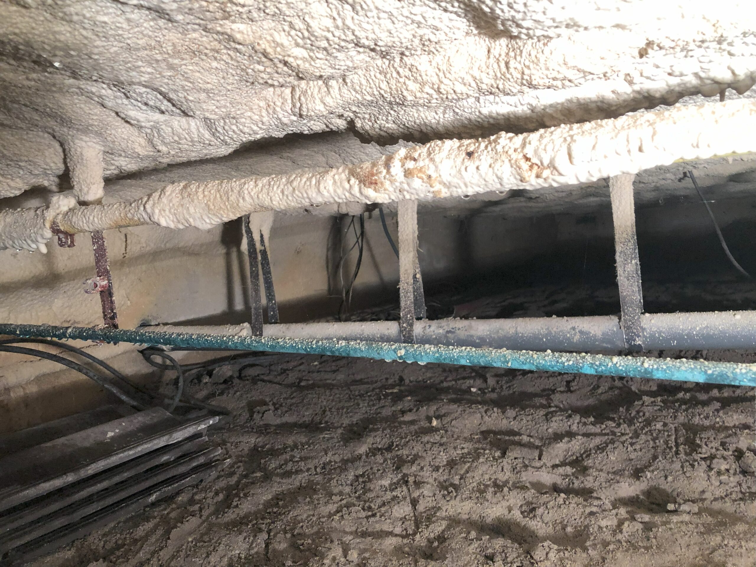 In een ver verleden was onze kruipruimte voorzien van een dunne laag gespoten PUR-isolatie. Om dit te verbeteren hebben we aan de onderzijde een 10 cm dikke PIR-plaat gelijmd. Dit verbetert het comfort, en maakt de vloerverwarming efficiënter.