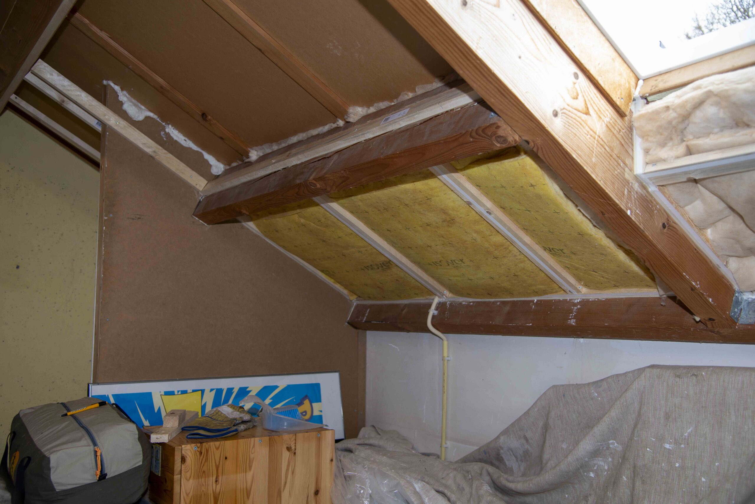 Het schuine dak van onze woning begint al op de eerste verdieping. In het midden van de woning (onder de nok) ligt een bak die onze zolder vormt. Dit maakt de kamers heel luchtig en ruim met een hoog (schuin)plafond maar het betekend ook veel warmteverlies. De vorige bewoners hebben de oude vlizotrap vervangen voor een vaste trap. Dit maakt de zolder veel beter toegankelijker maar ook dit heeft het nadeel van extra warmte verlies. Daarom wij begin 2021 het hele dak van binnenuit na geïsoleerd.
