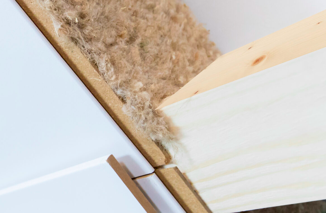 Na-isolatie met vlas. Witgelakte MDF-plaat met veer en groef met voorgelijmd vlasdeken.
