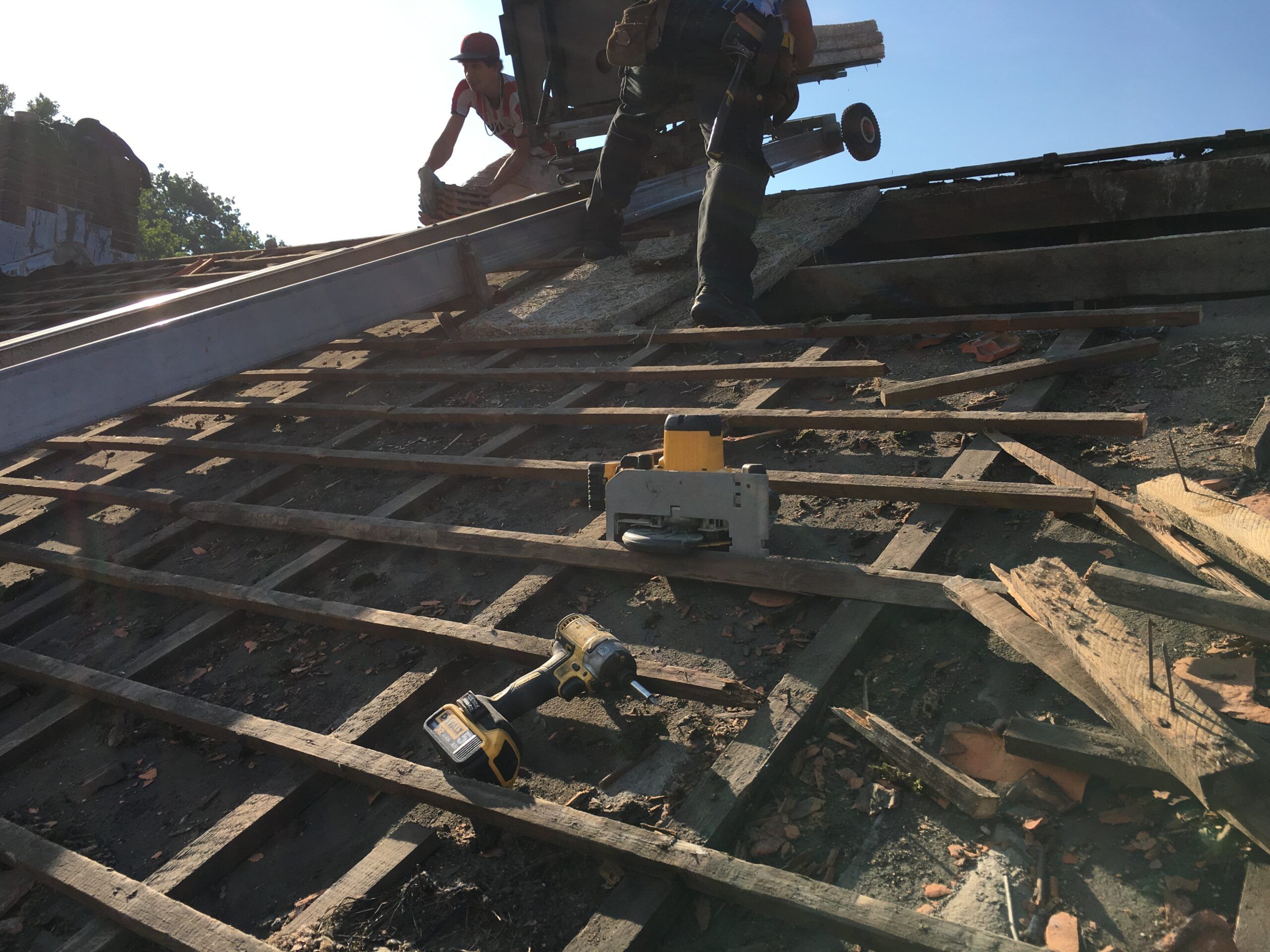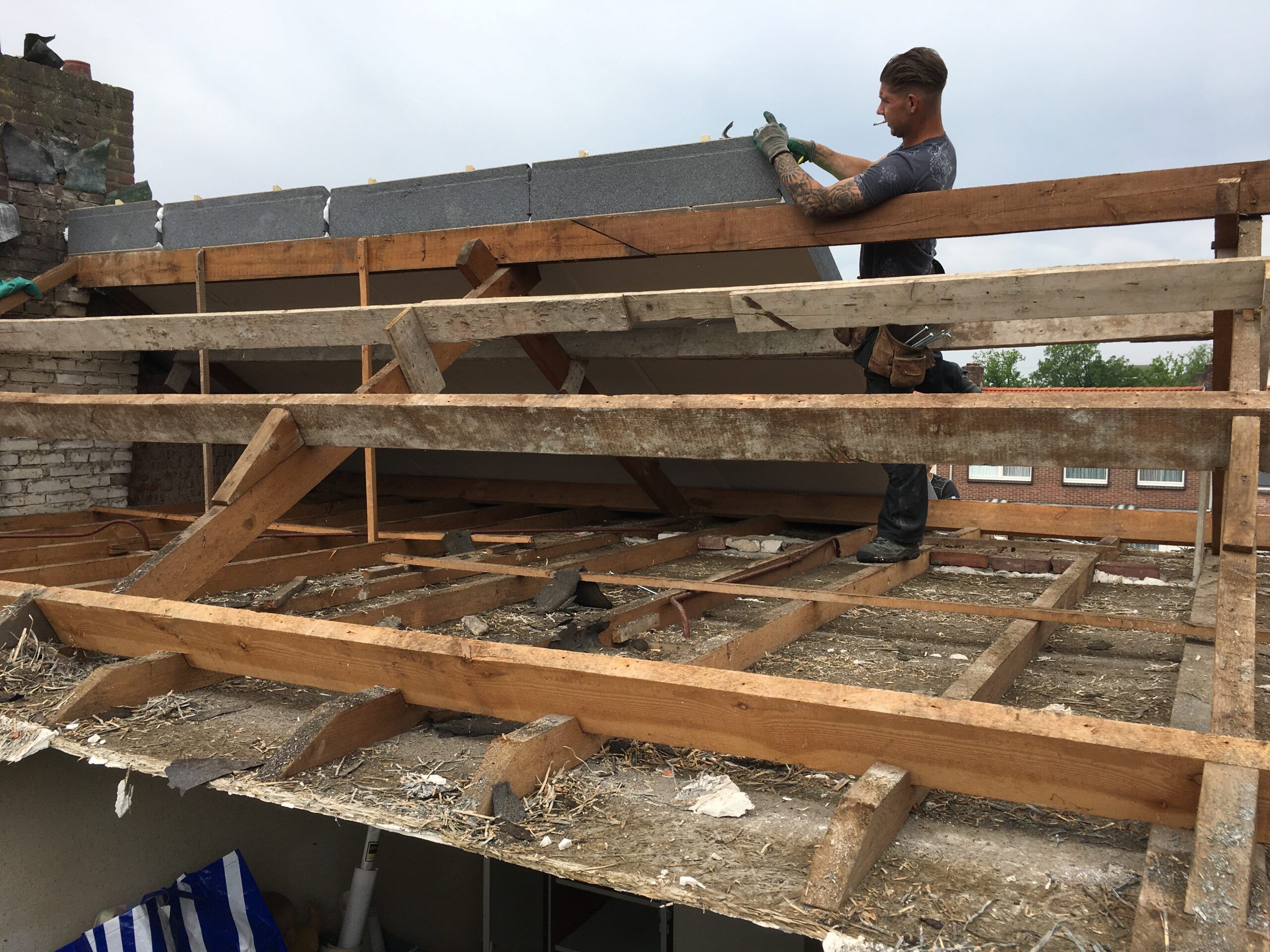 Na verwijderen van de oude 50mm houtwolcementplaten zijn 200mm dikke unidek RC6 panelen op de bestaande balken geplaatst. Het pannendak ligt nu 150mm hoger