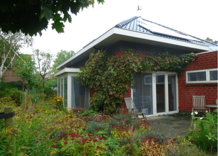 oriëntatie open aan zonzijde, buffer door garage aan noord/oost met groen dak op platte daken