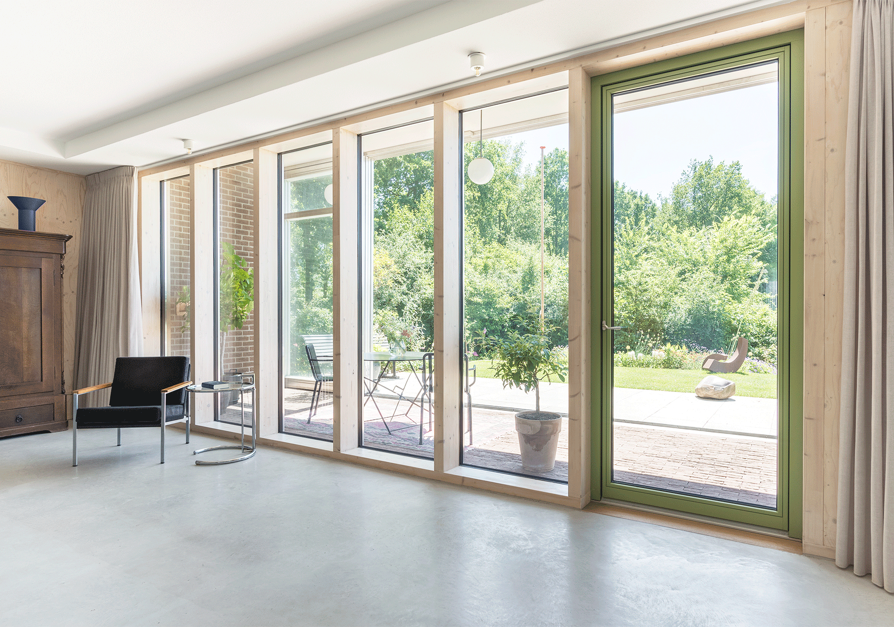 Het hoogte ontwerp van de tuinkamer geeft maximale zontoetreding in de woonkamer in de winter en verhindert zontoetreding in de zomer. Dit geeft een belangrijke bijdrage aan de regulering van het binnenklimaat.