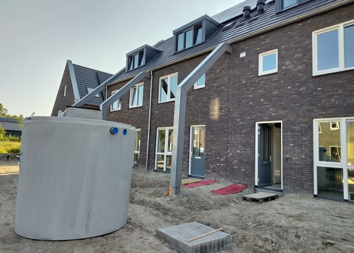 Een watertank geplaatst van 6m3 die aangesloten is op de regenpijp. Hiermee is de WC en wasmachine beneden aangesloten. Regenwater wordt opgeslagen in een tank in de voortuin.