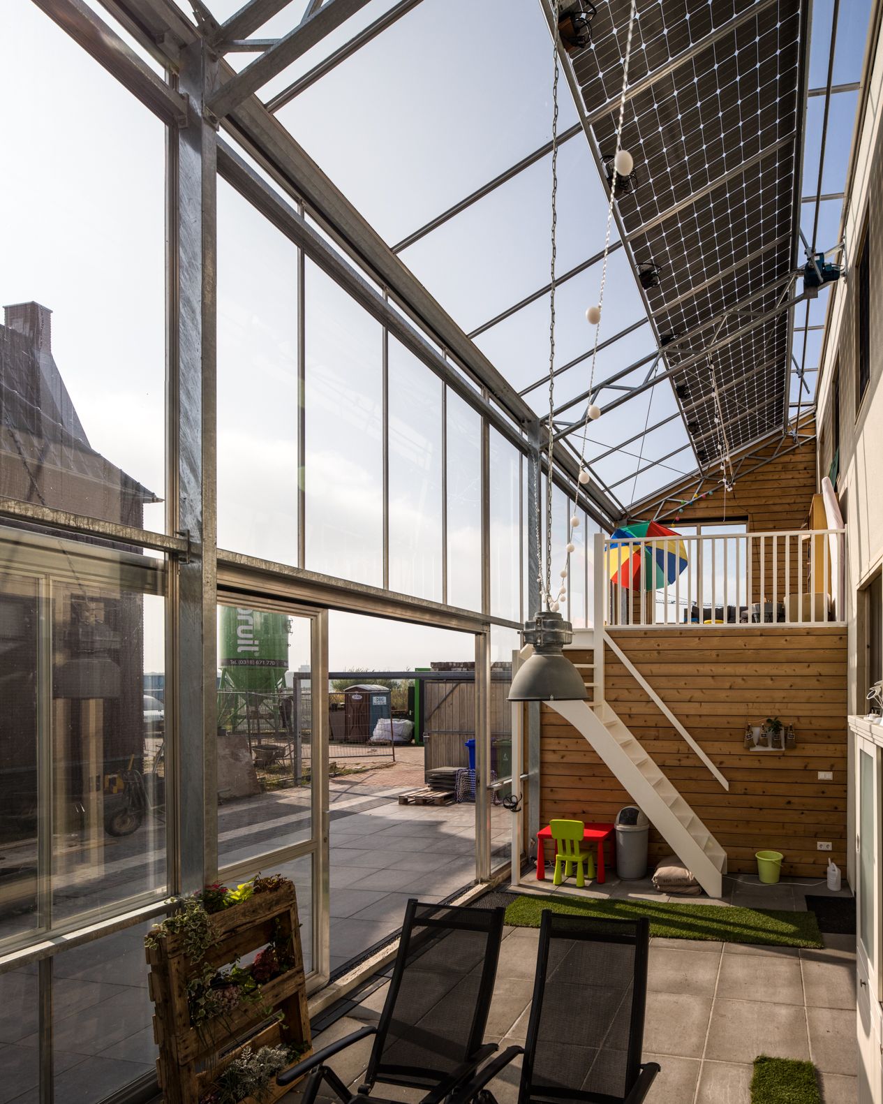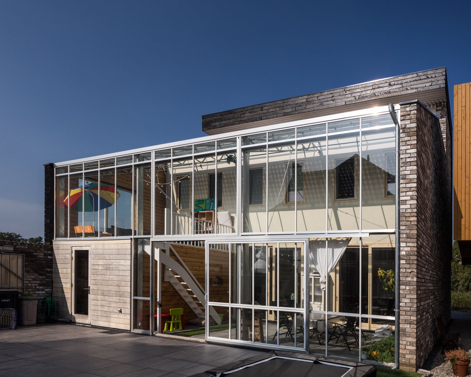 Geweldige ruimte om te zijn en de kinderen spelen er graag. Ze kamperen zelfs regelmatig in vakantieseizoenen in de kas met de tent 🙂 Het is van enkelglas en niet verwarmd anders dan via de zon. De ramen worden door temperatuur en het weer en neerslag automatisch gestuurd om te veel warmte kwijt te raken, met name in de zomer. Ook de integratie van de zonnepanelen in het dak is fijn, die geven in de zomer schaduw in de slaapkamers, en in de winter kan de zon er onderdoor zodat dan wel verwarmd wordt.