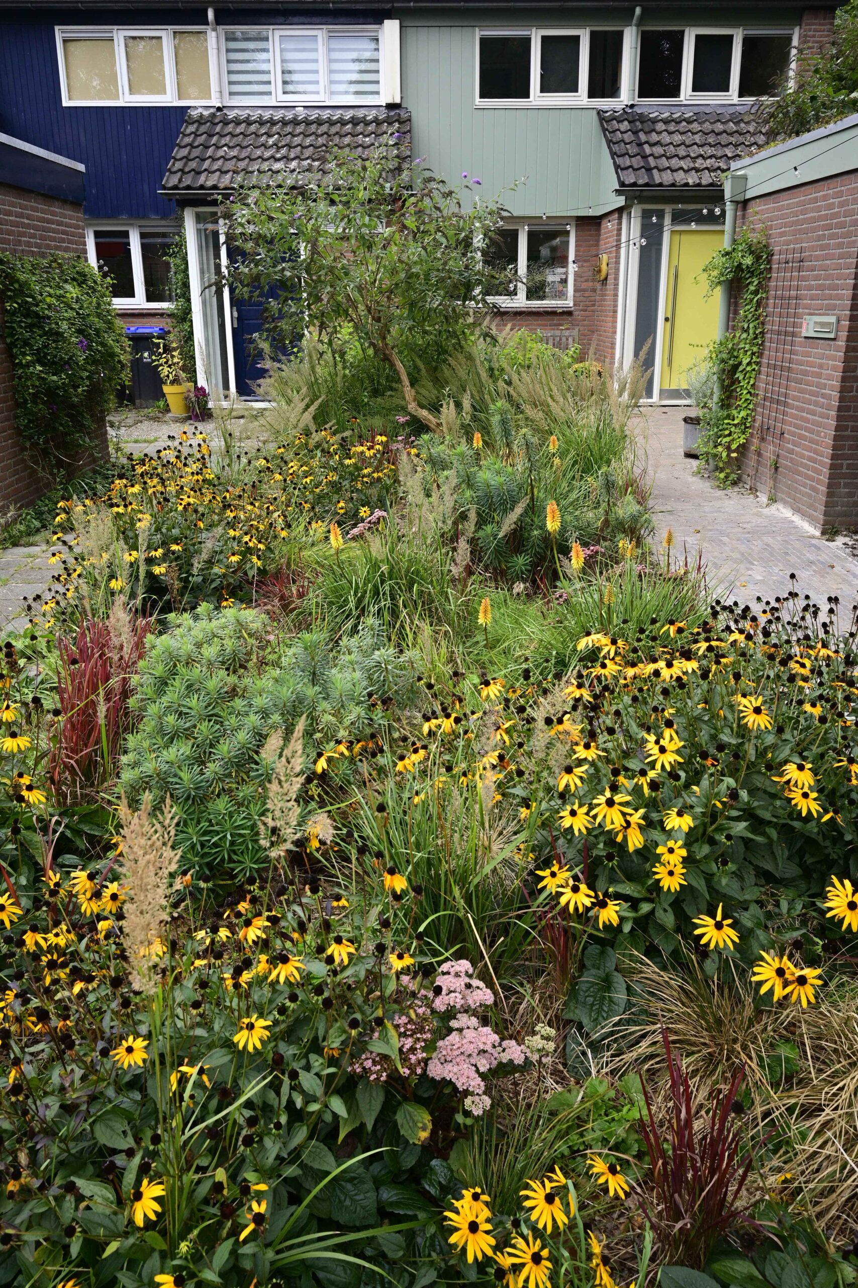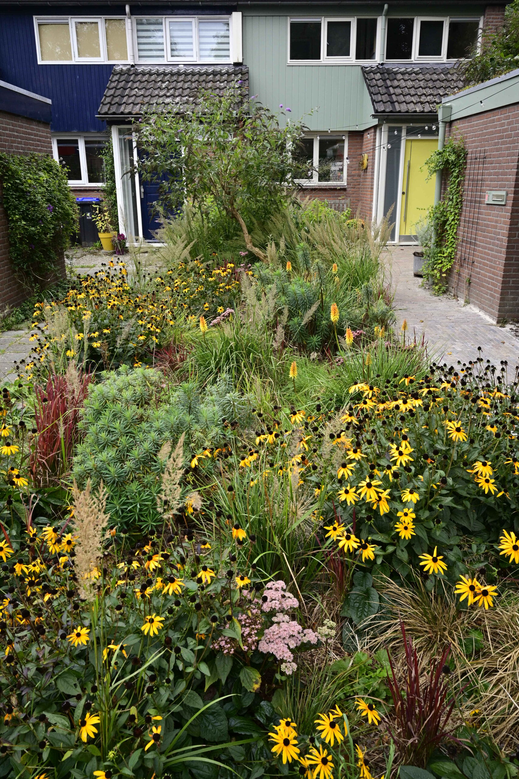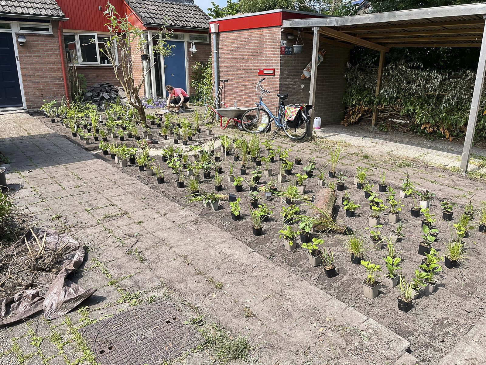 Achter hebben wij meer dan 500 tegels en klinkers plus een schuurtje verwijderd. Dit is vervangen door groene borders en een klein grasveldje. Voor hebben wij alles gerooid twee rijen van de oprit afgesnoept en hier samen met de buren nieuwe beplanting in gezet met veel inheemse soorten (en een paar mooie bollen). De schutting achter met de buren hebben we vervangen voor een duurzame schutting (die niet geïmpregneerd is) van de buurjongens. Op de andere grenzen van de tuin hebben we een beuken haag (Fagus Sylvatica) geplant. Naast het huis hebben we de erfscheiding middels een houtwal. Op het dak van de schuur hebben we een groendak aangelegd. In de toekomst willen we de carport vernieuwen en ook bedekken met begroeiing.