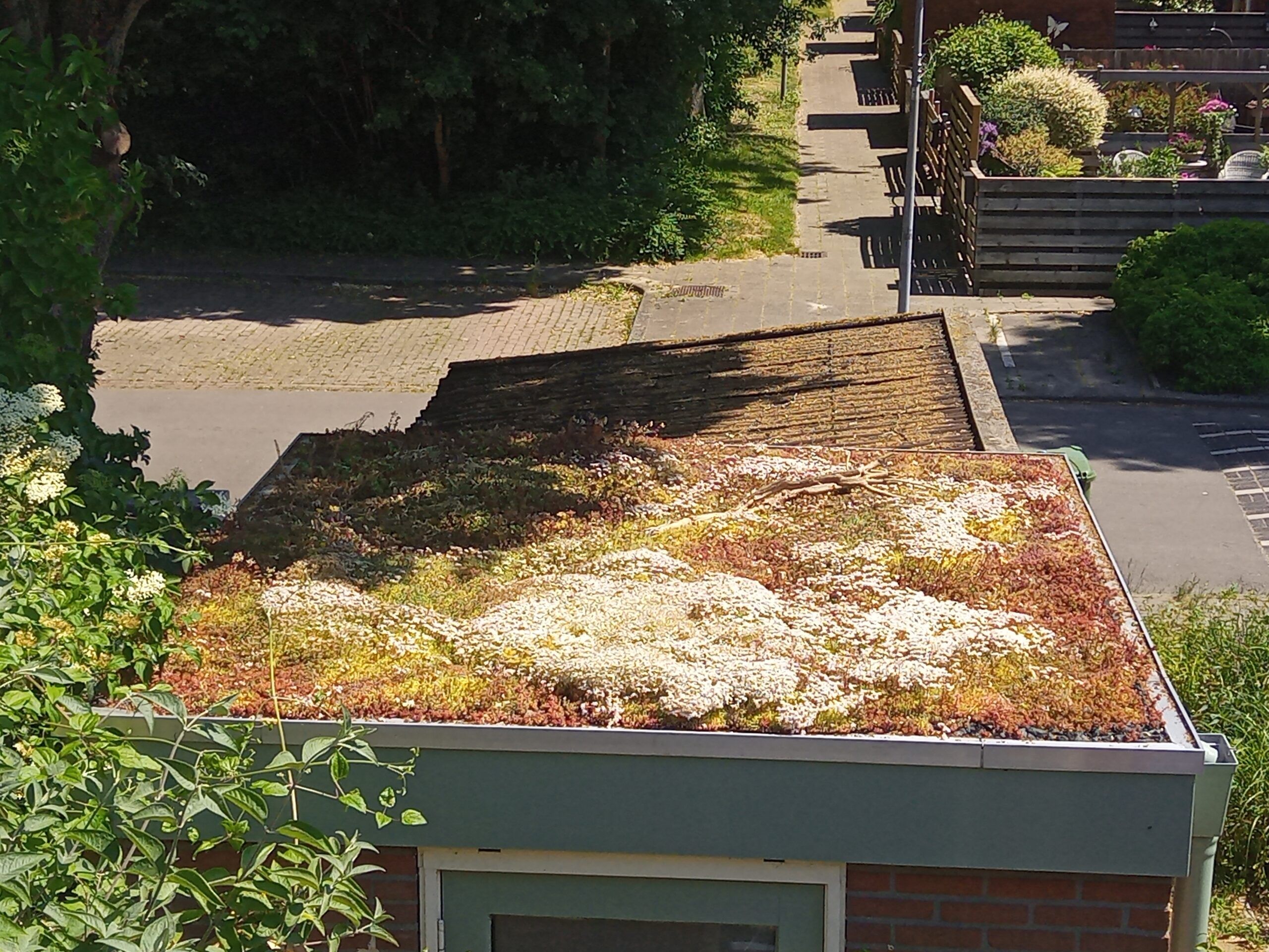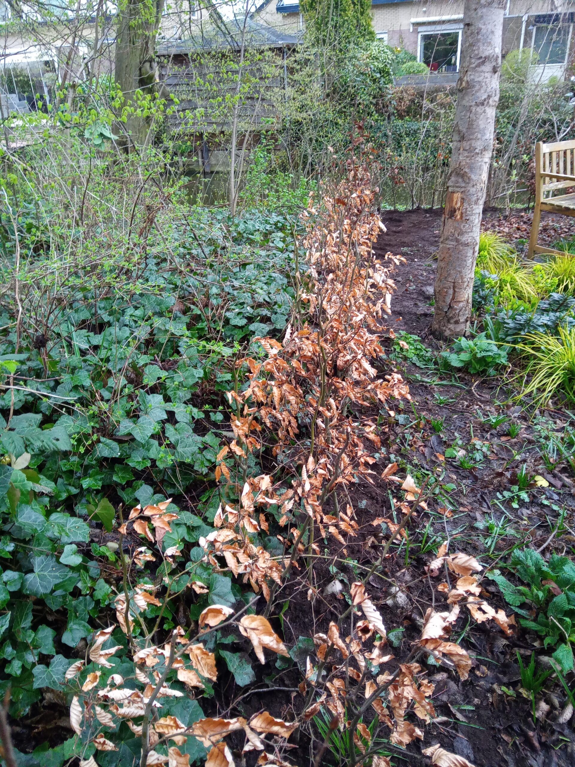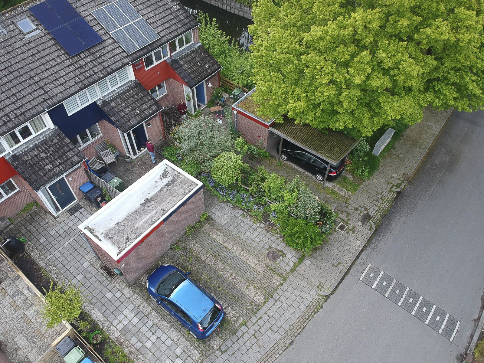 Achter hebben wij meer dan 500 tegels en klinkers plus een schuurtje verwijderd. Dit is vervangen door groene borders en een klein grasveldje. Voor hebben wij alles gerooid twee rijen van de oprit afgesnoept en hier samen met de buren nieuwe beplanting in gezet met veel inheemse soorten (en een paar mooie bollen). De schutting achter met de buren hebben we vervangen voor een duurzame schutting (die niet geïmpregneerd is) van de buurjongens. Op de andere grenzen van de tuin hebben we een beuken haag (Fagus Sylvatica) geplant. Naast het huis hebben we de erfscheiding middels een houtwal. Op het dak van de schuur hebben we een groendak aangelegd. In de toekomst willen we de carport vernieuwen en ook bedekken met begroeiing.