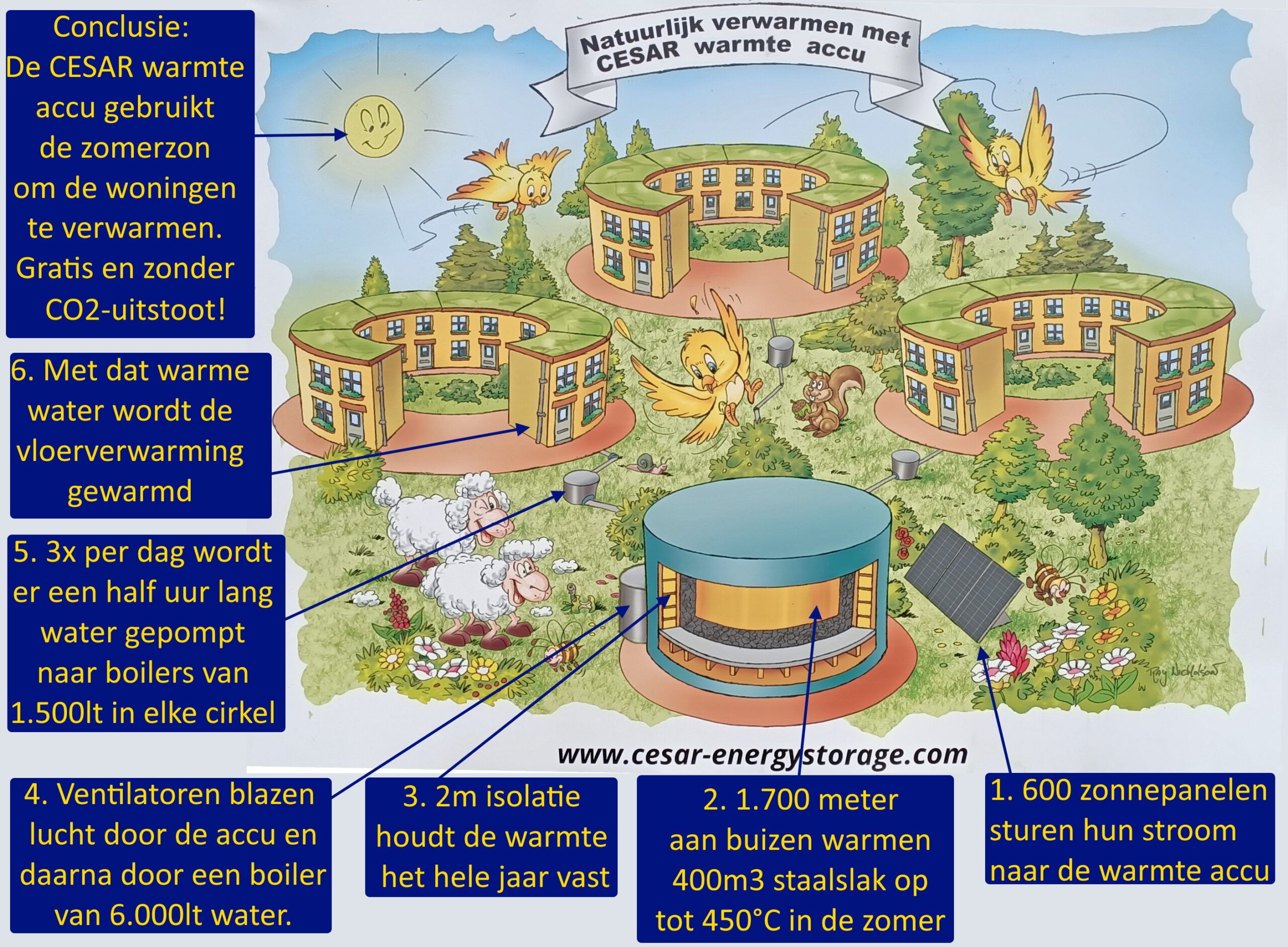 De CESAR warmte accu voorziet 36 woningen van warmte die in de zomer wordt opgeslagen in 400m3 staalslak op een temperatuur van 450 graden Celsius. Er zit bijna 2m isolatie omheen met een Rc waarde van 35 waardoor de warmte het hele jaar vastgehouden wordt. Het verwarmen van onze woning kost geen energie van buiten, geen energierekening, dus. Ook komt er geen CO2 vrij.