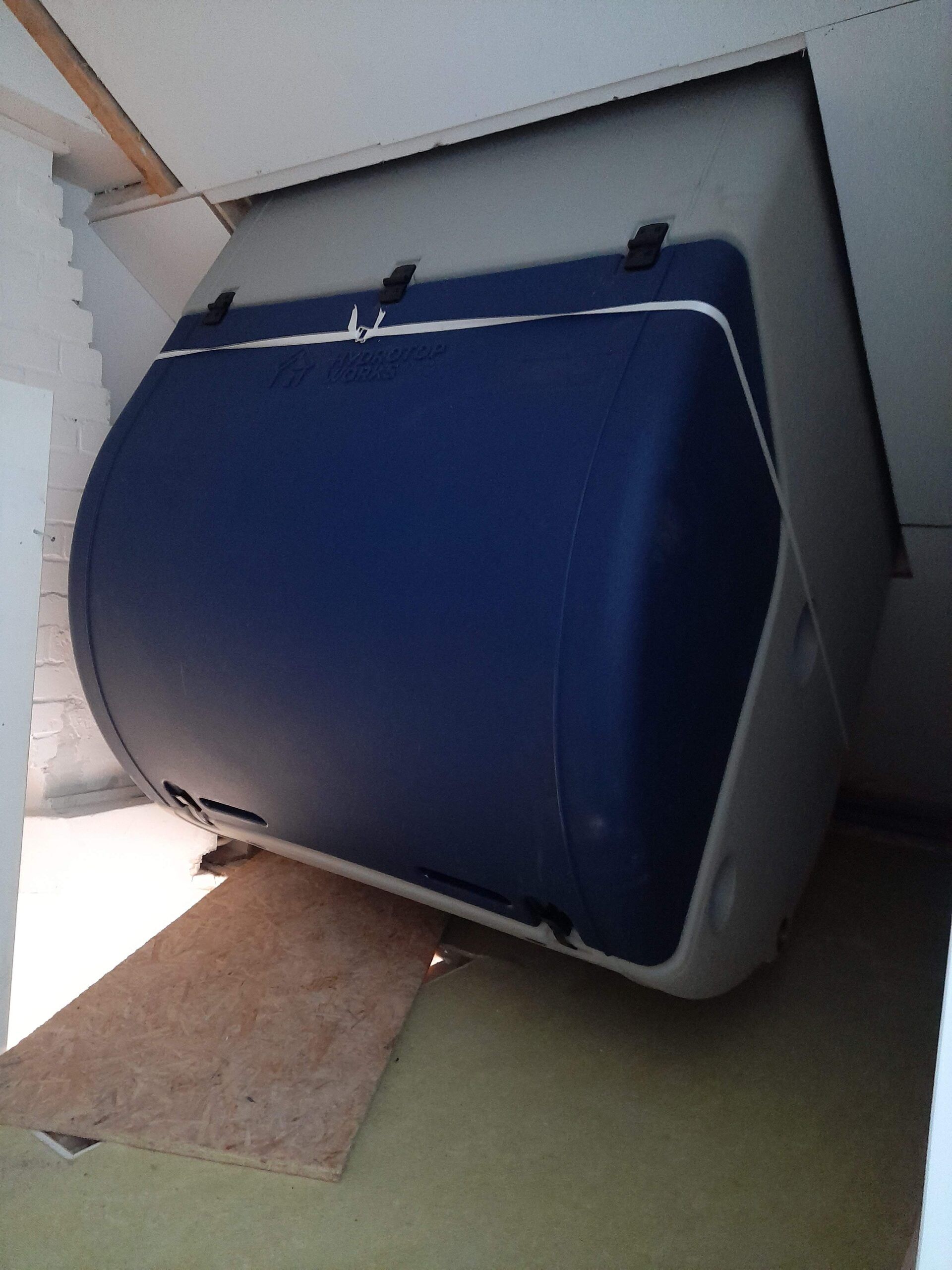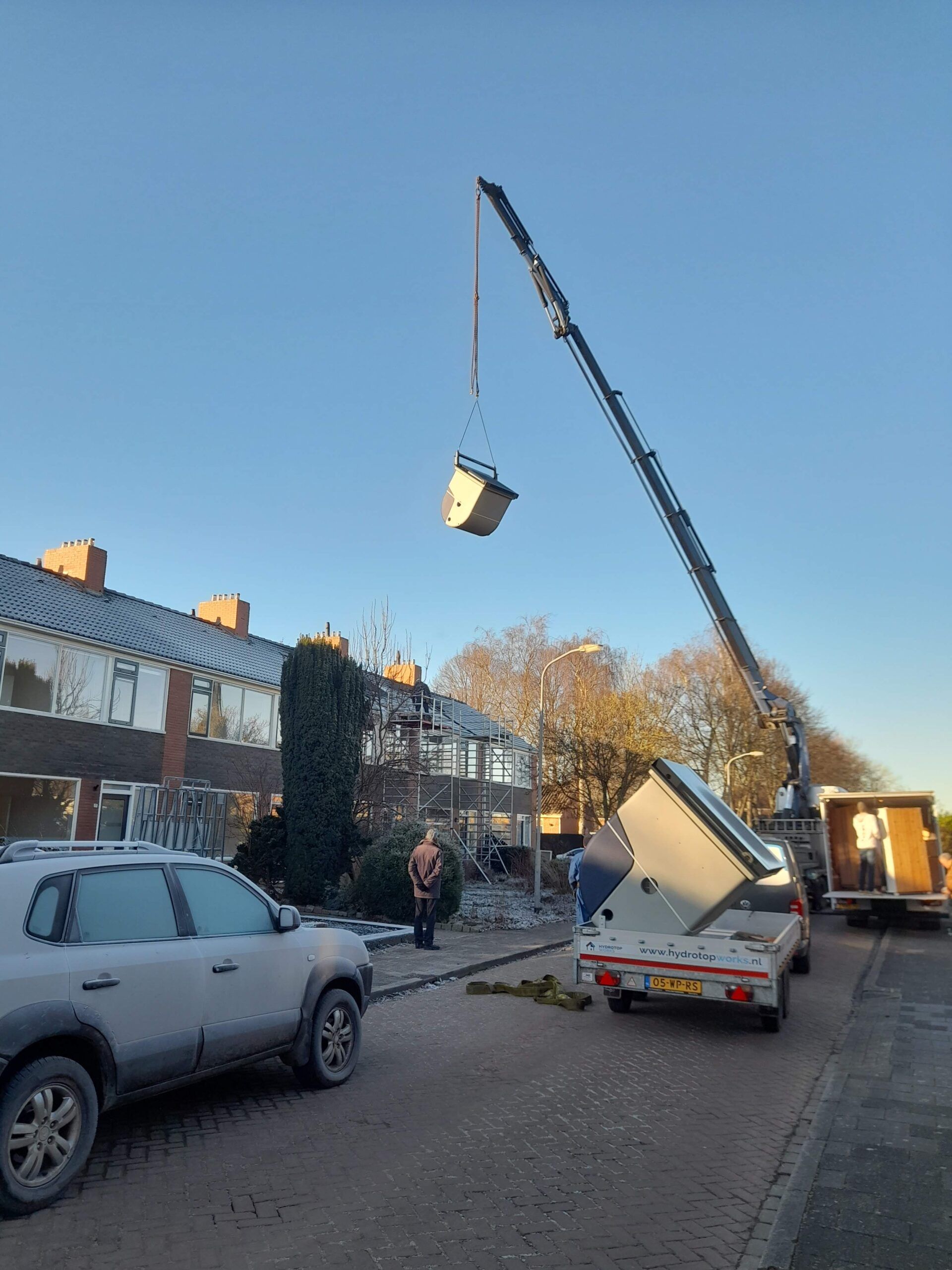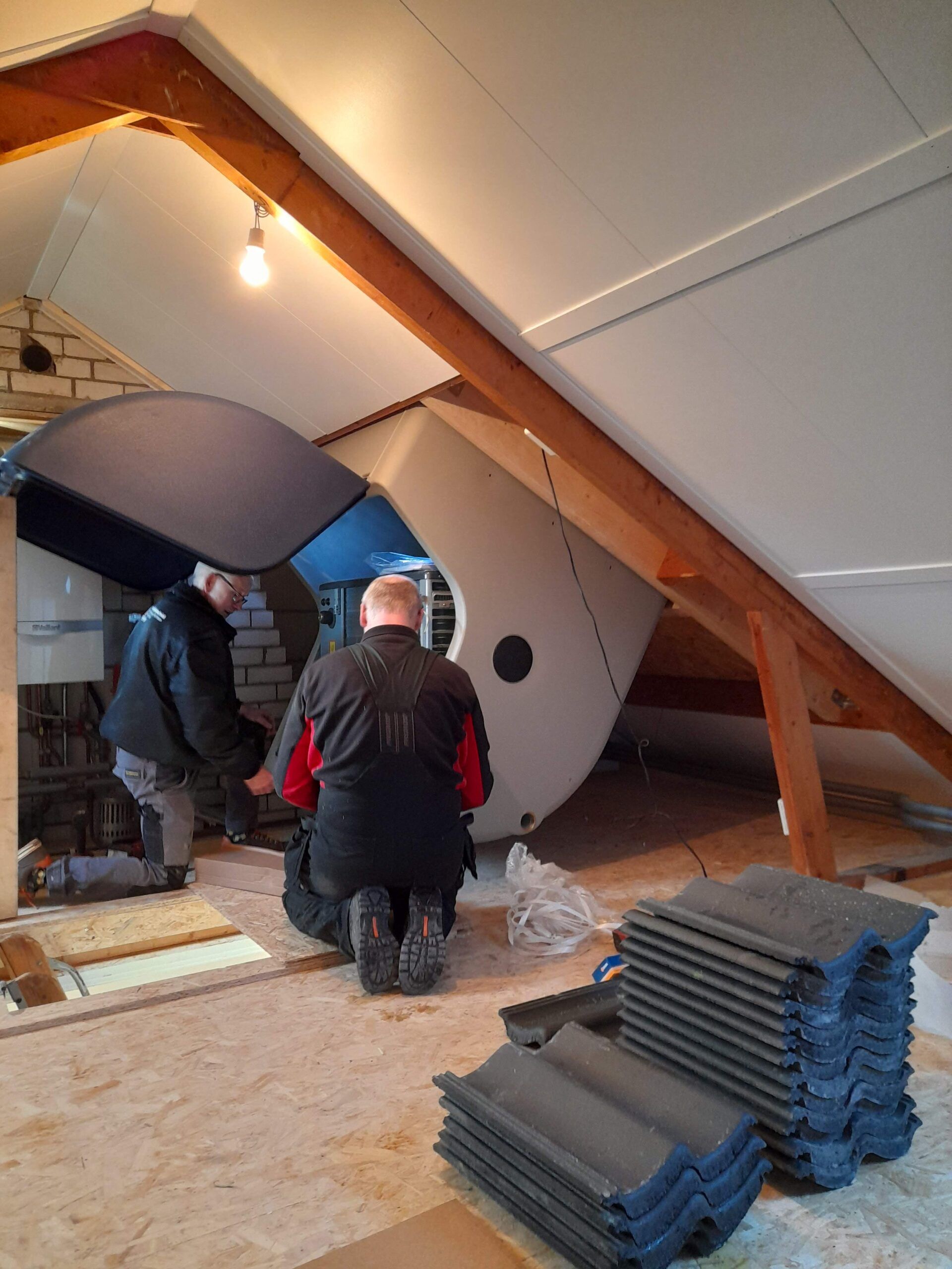 Warmtepomp met buitenunit voor-geïnstalleerd in hydrotop zodat deze binnen het dakvlak kan (i.p.v. tegen gevel of in de tuin).