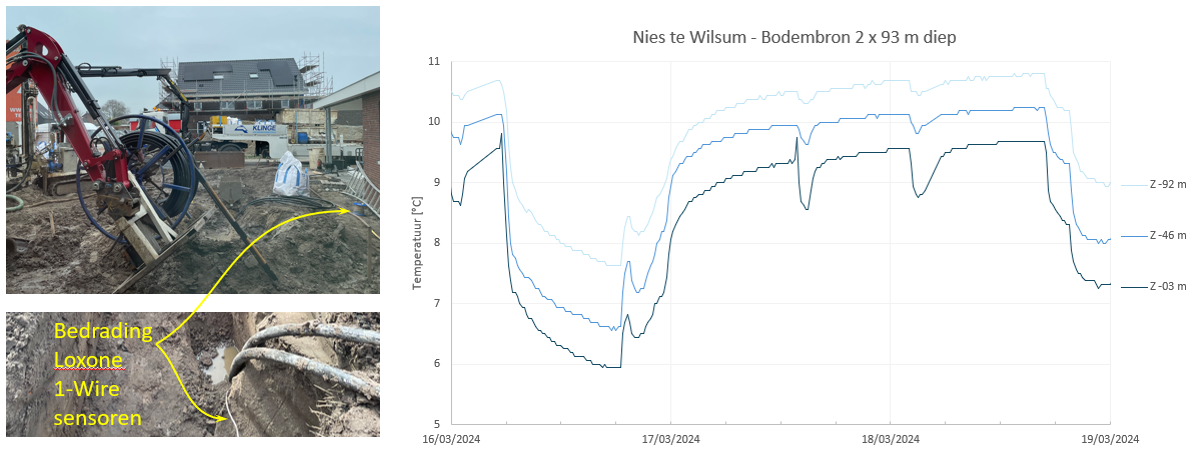 De Loxone 1-wire sensoren middels dubbel gesealde lassen aan de verbindingsdraad gelast. Ondanks alle zorg zijn de sensoren na een paar weken gestopt met communiceren. De eerste cycli zijn wel gemeten, het is mooi om te zien dat de eerste meters (Z voor de zuidelijkste van de twee bronnen en 03 m voor 3 meter diep) het sterkst in temperatuur daalt, en onderin op 92 meter diepte. Het laat ook zien dat binnen een paar uur de bodem de warmte weer heeft aangevuld/vereffend.