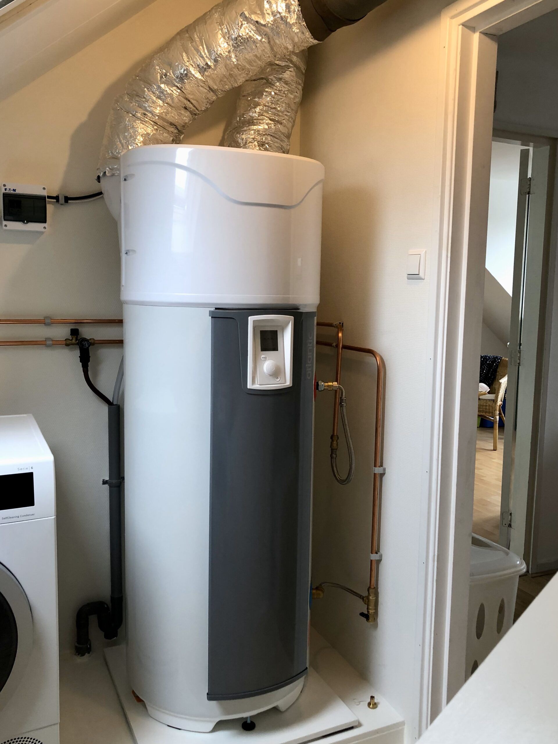 Voor het warm water in de badkamer hebben we een warmtepompboiler op zolder geplaatst. Dit apparaat haalt de warmte uit de buitenlucht en ventilatielucht, en warmt d.m.v. een kleine warmtepomp een boilervat van 200 liter op.