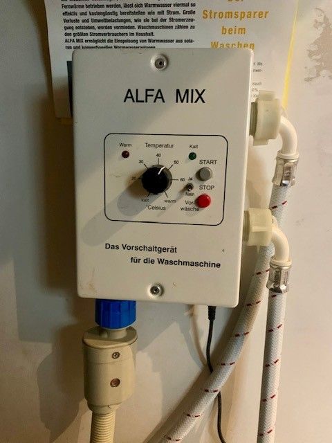 De wasmachine krijgt zijn warme water van de buffer die gewarmd door de zon en/of de warmtepomp met een externe regelaar. Alfa mix.
