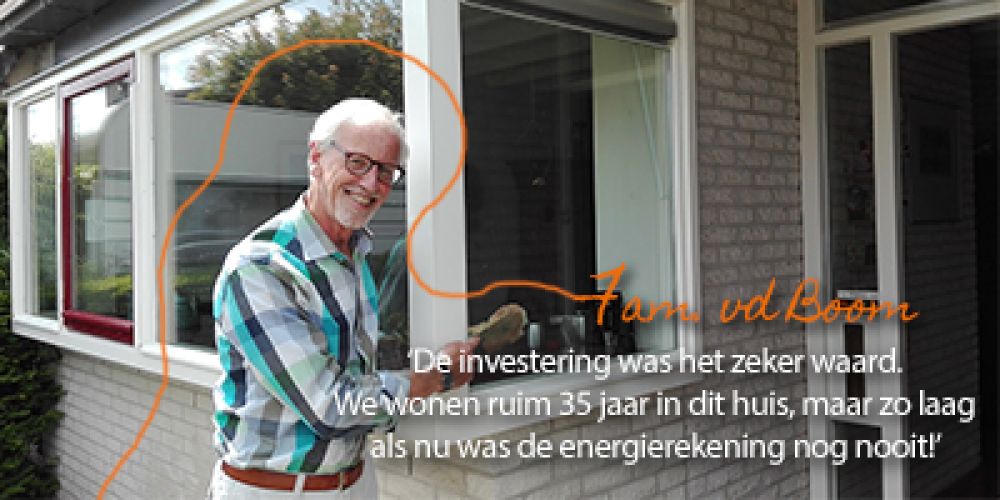 De aanwezigheid van een vriend als ervaringsdeskundige op een duurzaamheidmarkt in 2015 in Harderwijk was de aanleiding voor Van der Boom om daar eens te gaan kijken. Hij raakte in gesprek met een glasbedrijf over HR++-glas. De informatie in combinatie met een subsidie maakte het aantrekkelijk om deze maatregel te nemen. Zijn aanstekelijke enthousiasme zorgde ervoor dat er gezamenlijk met 13 buren ingekocht werd.