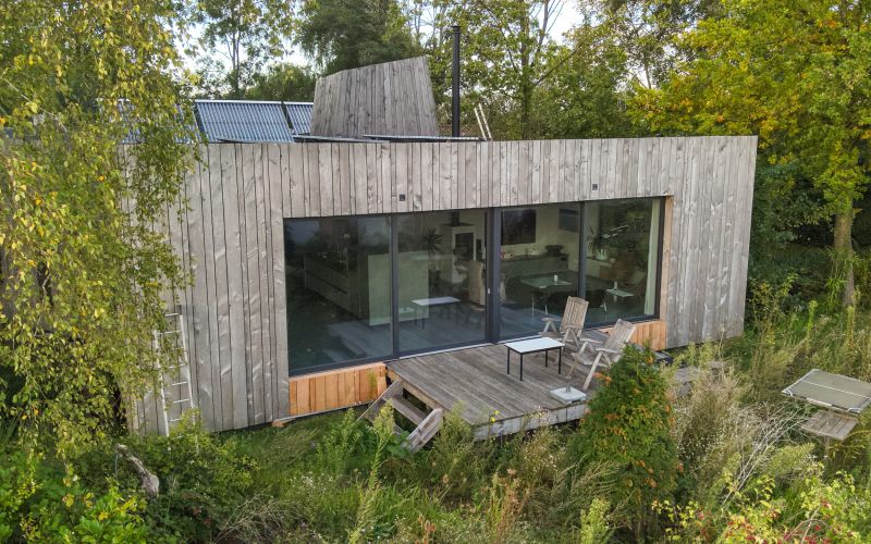 Houtskeletbouw Vrijstaande woning – 2023, Schildwolde Geheel houtskelet, m.u.v. stalen draagbalk in woonkamer. Prefab wanden van lokaal stro. Bekijken