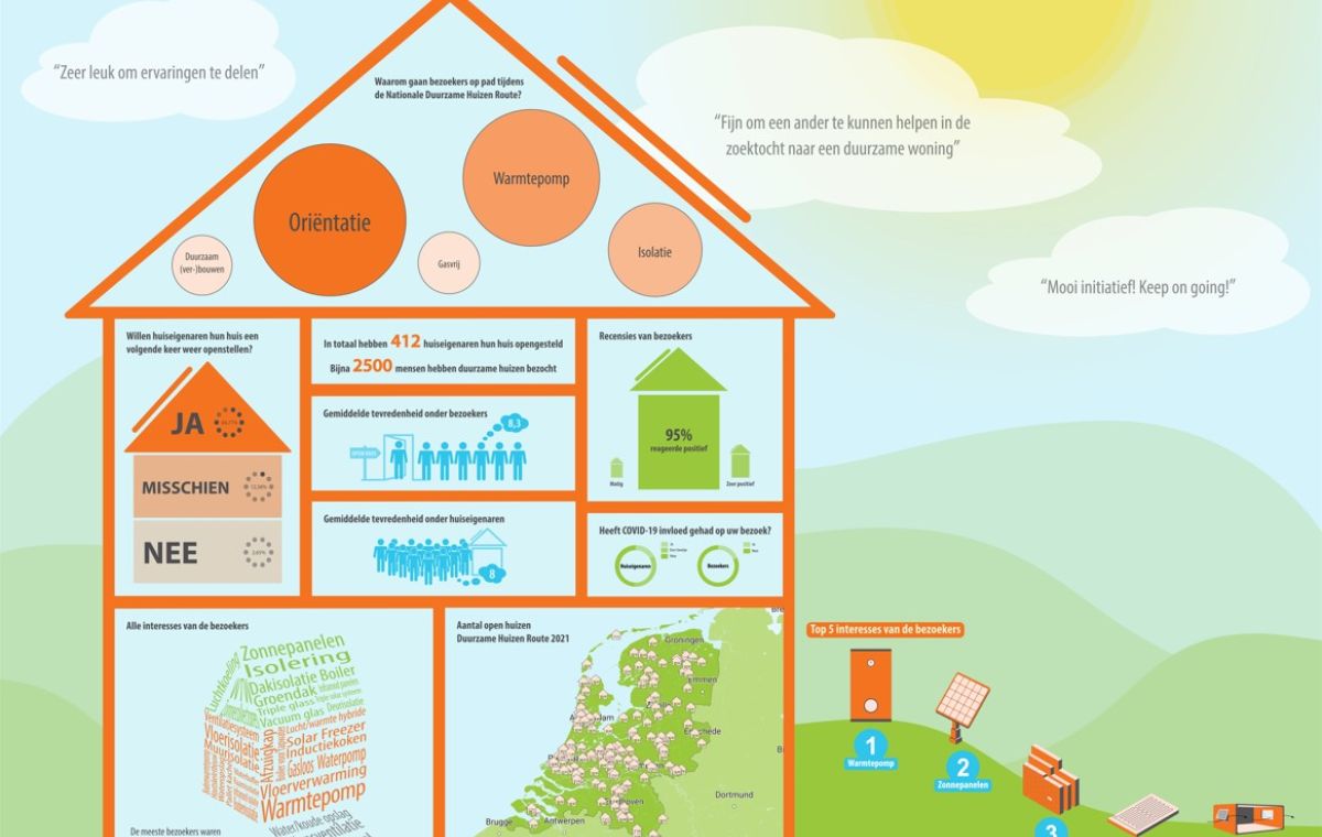 Vorig jaar is er vanuit de Duurzame Huizen Route een enquête verstuurd naar bezoekers en huiseigenaren van de Duurzame Huizen Route 2021. Vier studenten van de Hogeschool Utrecht zijn afgelopen tijd met de resultaten aan de slag gegaan. Ze hebben hiervan een mooi visueel overzicht gemaakt. Uit de resultaten blijkt dat huiseigenaren en bezoekers zeer tevreden zijn over de Route van 2021: ze geven hun ervaring gemiddeld een 8.