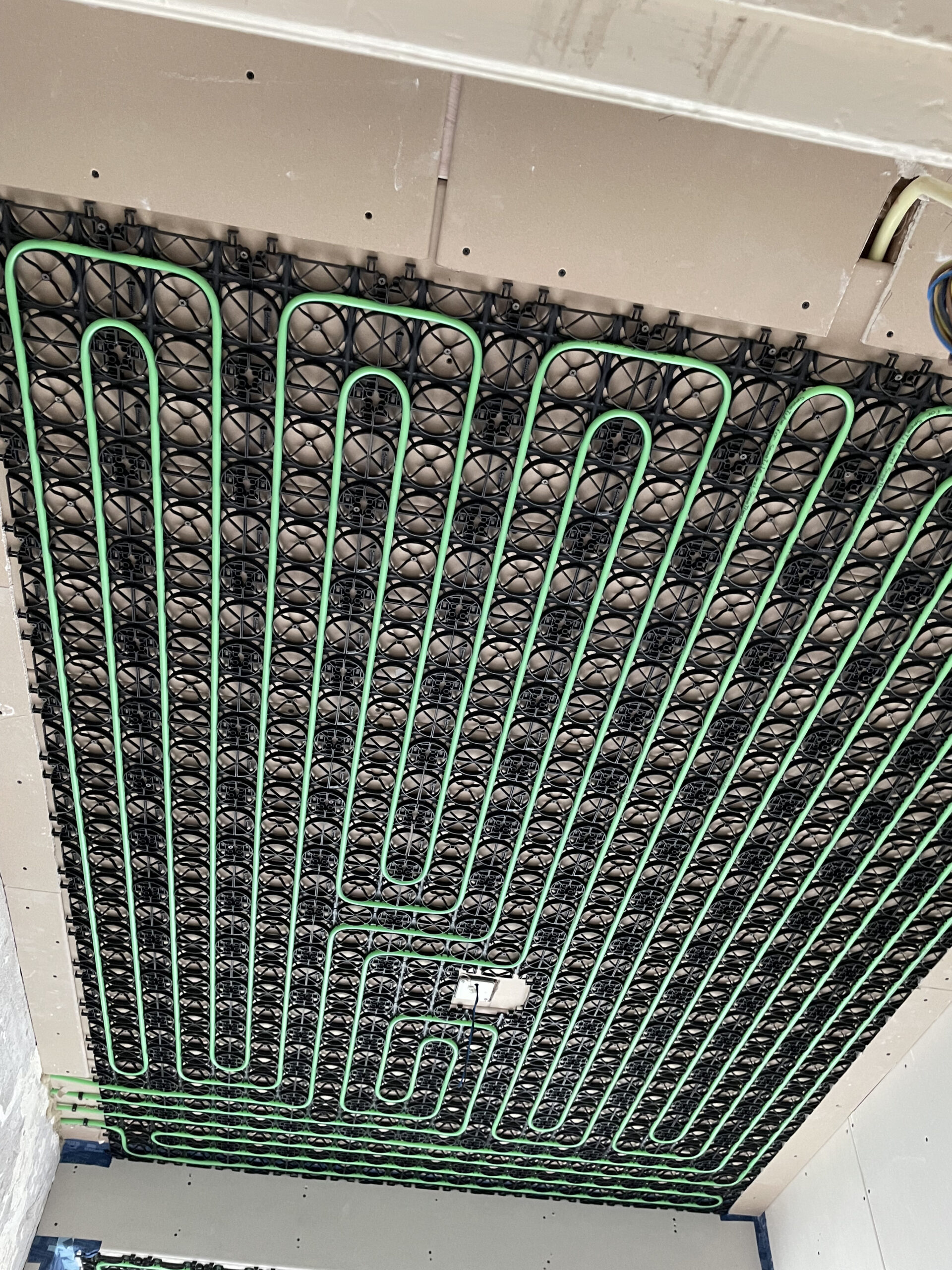 De woning wordt verwarmt met een Warmtepomp merk Vaillant arotherm split v.v. een warmtepomp boiler. Als afgiftesysteem is gekozen voor een WARP SpeeTile plafondsysteem. In de zomer kan ook gekoeld worden.