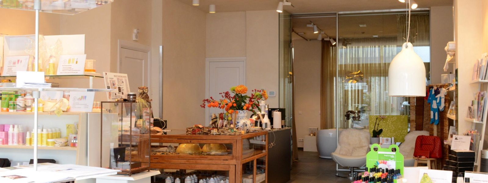 Winkelruimte en schoonheidssalon waar bij verbouwing tot huidige zaak zoveel mogelijk gebruik is gemaakt van duurzame materialen. Bruin leem en leemstuc op alle muren. Buizen verwarmingssysteem in de muren. Meubilair veelal duurzaam materiaal. Verlichting: lampen zo energie zuinig mogelijk.