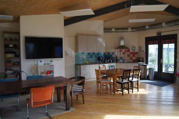 Het houtskelet gebouw heeft een bijzondere vorm, een aflopend groendak en op de zuidkant zonnepanelen. Het is goed geisoleerd en wordt alleen tijdens gebruik verwarmd- dit gebeurt met infrarood panelen.