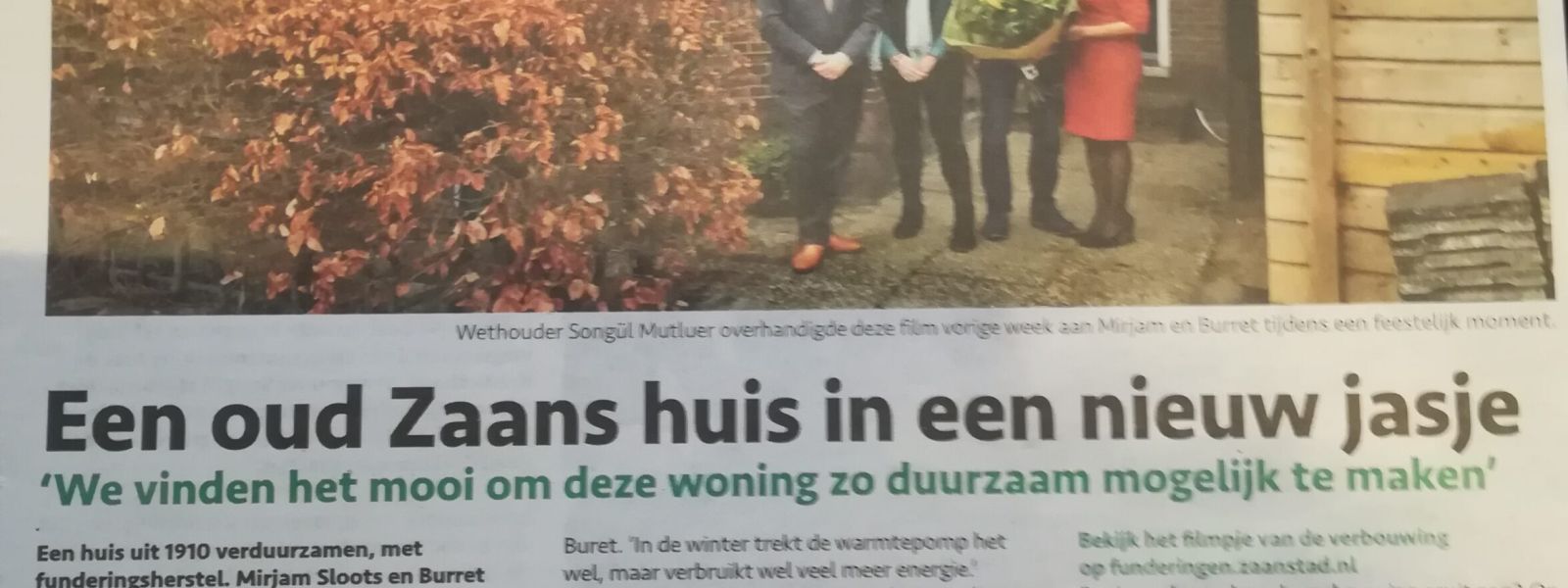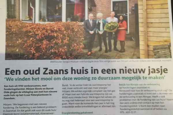 Ons huis uit 1910 is in 8 maanden gefundeerd, verbouwd en duurzaam gemaakt. Het kost veel geld, laat dat duidelijk zijn. Mirjam en ik vinden het belangrijk onze bijdrage aan duurzaamheid te leveren. Daarom kozen we voor deze verbouwing met isolatie, warmtepomp, pelletkachel en 20 zonnepanelen. We hebben een volledig elektrische auto en eigen laadpaal. We gebruiken vanwege de auto en de vloerverwarming 7500 kwh elektriciteit. Best veel kwh. Onze zonnepanelen produceren 6500 kwh per jaar. We proberen zoveel mogelijk ‘eigen’ elektriciteit te gebruiken, zoals het laden van de auto, wanneer de zon schijnt. Dan gaat de elektriciteit nl. direct naar de auto. Dat lukt natuurlijk niet zo altijd. Als we eigen elektriciteit terugleveren en later elektriciteit gebruiken is het natuurlijk ook duurzaam. We gebruiken 500 m3 gas. Dat laatste hopen we lager te krijgen. Onze woning houdt de warmte erg goed vast. In het Stadsblad schreef journalist Dirk Karten zes mooie artikelen. In het Ned.dagblad stond ook een artikel. De gemeente Zaanstad maakte een film: https://youtu.be/swJ2FdcE-Sg”>https://youtu.be/swJ2FdcE-Sg m.m…. Floortje van der Vlist. Hieronder staan de artikelen, vanaf de laatste gerangschikt. Eerste artikel: https://www.rtvzaanstreek.nl/-met-filmverslag-%E2%80%98kan-een-warmtepo…; Lees hier het interview met warmtepomp-leverancier Nick Boereboom: https://www.facebook.com/watch/?v=864261497256706″>https://www.facebook… Karten schreef zes artikelen. Het geeft een goede impressie van alles wat er komt kijken bij een verduurzaming en verbouwing. Febr. 2019–april 2021Zesde artikel, april 2021Sluitstuk zonnepanelen op ‘meest duurzame woning’ blijkt struikelblok. Tekst en foto’s Dirk Karten (DKmedia) 30 april 2021 ZAANDAM – ‘Eind goed, al goed’ verzuchten Mirjam Sloots en Burret Olde als 13 april de laatste van de twintig zonnepanelen wordt gemonteerd op hun ‘meest duurzame Zaanse woning’. Meer dan een jaar later dan gepland dankzij een anonieme melding waardoor de bouw van het ‘lessenaarsdak’ werd stilgelegd en een moeizaam traject begon om een vergunning te krijgen. “Gelukkig heeft het duurzaamheidsbeleid van de gemeente Zaanstad gewonnen van de regeltjes.”Het is januari 2019. Het echtpaar begint aan een grootscheepse verbouwing van hun huis op het Czaar Peterplantsoen 2. Van funderingsherstel tot nieuw dakbeschot. Van warmtepomp tot plaatsing van twintig zonnepanelen. Geen centimeter in de verouderde woning wordt overgeslagen om hun doel te bereiken: de woning uit 1910 nagenoeg energieneutraal maken. Na acht maanden buffelen sliepen Burret en Mirjam op vrijdag 30 augustus 2019 voor de eerste keer in hun Zaanse woning.Voorbeeldfunctie gemeenteLos van de aanschaf van de woning en het funderingsherstel, stak het duo een slordige 60.000 euro in het verbouwingsproject voor het duurzaam maken van de woning. Het bijzondere resultaat viel ook de gemeente Zaanstad op. Zo bezocht wethouder Songül Mutluer op 9 november 2019 het huis van de familie als onderdeel van de Duurzame Huizen Route. De gemeente maakt zelfs een film https://youtu.be/swJ2FdcE-Sg”>https://youtu.be/swJ2FdcE-Sg (van Floortje van der Vlist) van het project als voorbeeldfunctie. Aan de ene kant is de gemeente Zaanstad goed bezig met een lijst aan subsidiemogelijkheden voor kleine duurzame verbeteringen van woningen. Tegelijk is het dezelfde gemeente die het duurzame tweetal het leven lastig maakte om het project af te ronden door de laatste fase: de plaatsing van zonnepanelen.Anonieme melding“Voor een optimaal rendement, 6500 Kwh, wilden we het zadeldak van onze schuur vervangen door een zogenaamd ‘lessenaarsdak’; een schuin, naar de zon geplaatst dak”, vertelt Burret. “Maar toen we begin februari 2020 bijna klaar waren met het nieuwe dak, moesten we de bouw stilleggen. Iemand had anoniem bij de gemeente een melding gemaakt, wat leidde tot een bouwstop.”Burret had in december 2019 voor de aanpassing van het dak online een formulier ingevuld en bij de gemeente telefonisch gecheckt of het klopte dat er voor de verandering van het dak geen vergunning nodig was. “Ja, misschien dom van mij dat ik dat telefonisch gedaan had. Ik kreeg te horen dat het goed leek. Voor het plaatsen van zonnepanelen is sowieso geen vergunning nodig. ” Met spijt in z’n stem vertelt hij dat het afgaan op die mondelinge reactie het echtpaar nu zo’n dikke 3000 euro extra heeft gekost.1600 euro legeskosten…“De bestelde dakpannen lagen al op de vrachtwagen en moesten terug: extra kosten. Onze eigen bouwtekening was voor een officiële vergunning niet voldoende en moest vervangen door een exemplaar van een officieel bouwkundig bureau. We moesten een tijdelijk dak plaatsen want het oorspronkelijke dak met asbestplaten was al weg. Dan heb ik het maar niet over de bijna 1600 euro legeskosten die we uiteindelijk moesten betalen”, aldus het echtpaar.Op 18 februari 2020 werd een vergunning aangevraagd. Pakken papier moesten ingevuld en steeds weer aangevuld. Burret en Mirjam werden in het traject bijgestaan door erkende bouwbedrijven waardoor de papierwinkel steeds goed onderbouwd werd aangeleverd.Opgeven geen optie“We zijn heel blij met Bouwkundig Adviesbureau Marco Maarsseveen uit Krommenie die de bouwtekeningen maakte en waar mogelijk geholpen heeft. Gelukkig zijn we beiden doorzetters, maar er waren momenten dat we dachten ‘we stoppen ermee’. Maar ja, juist met de opbrengst van de zonnepanelen zouden we het huis praktisch energieneutraal kunnen maken. Dit is het sluitstuk van ons hele duurzame project. Opgeven was geen optie.” Geen buren maar lelijke mastDe vergunning werd twee keer afgewezen. Zowel de Welstand- als Stedenbouwkundige commissie oordeelde negatief. Om een doorbraak te forceren in de communicatie via papier en mail, nodigde het duurzame duo de verantwoordelijke besluitvormers uit een kijkje ter plaatse te komen nemen.“Ons doel was om aan te tonen dat niemand last heeft van de aanpass