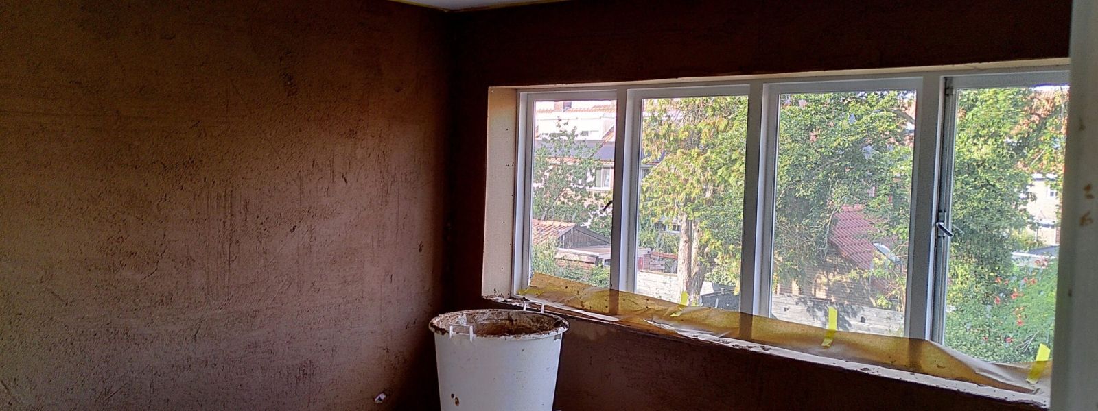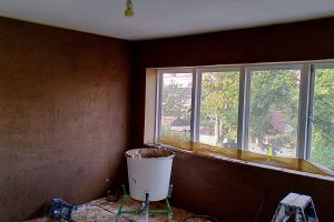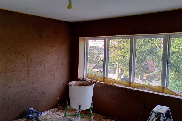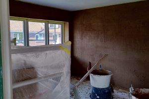 Houtvezelisolatie moet ademen. Daarom hebben we alle wanden gestuct met Leem. Voor de badkamer en keuken hebben we natuurkalk gebruikt.
