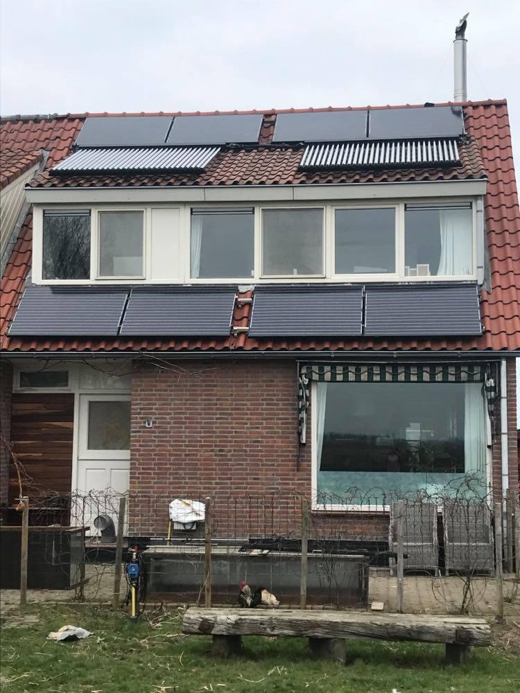 8 PVT panelen ( 2080 wp op 242 gr zuid-west ) ( thermische functie afgekoppeld en vervangen voor Heatpipes ivm hoger rendement )
