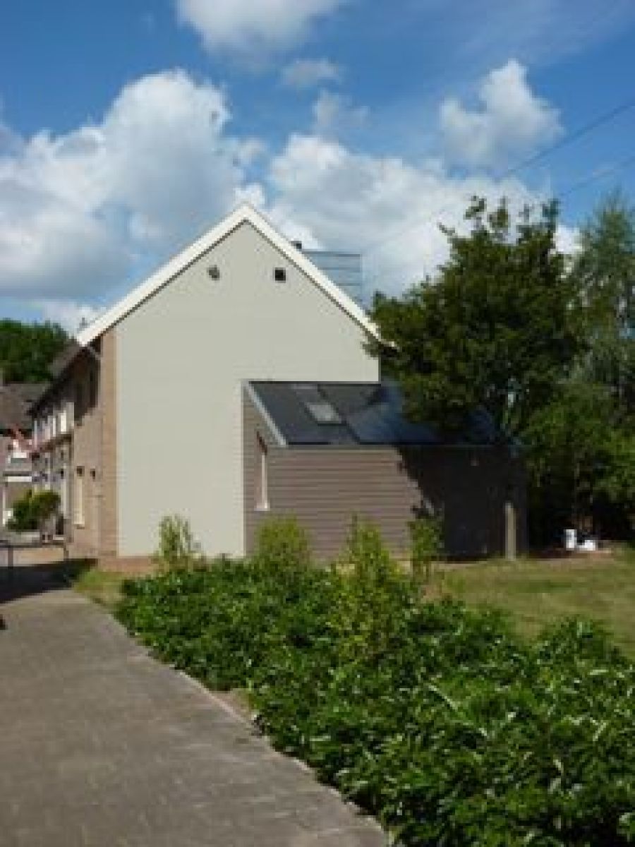 Ons hoekhuis uit 1960 is energie-neutraal gemaakt door verbouwing tot passief huis. Daarvoor is het buitenspouwblad verwijderd, een isolerende schil aangebracht (incl bg vloer en dak), en tevens hebben we de woning uitgebreid met oa een woonkeuken in houtskeletbouw. In de resterende energiebehoefte kunnen we voorzien dmv 28 zonnepanelen.Het gaat om een hoekwoning in een rijtje van 4, met een grondoppervlak van 6 bij 7 m2. Na spouwmuurisolatie en vloerisolatie had de woning voor de recente verbouwing energie-label D.