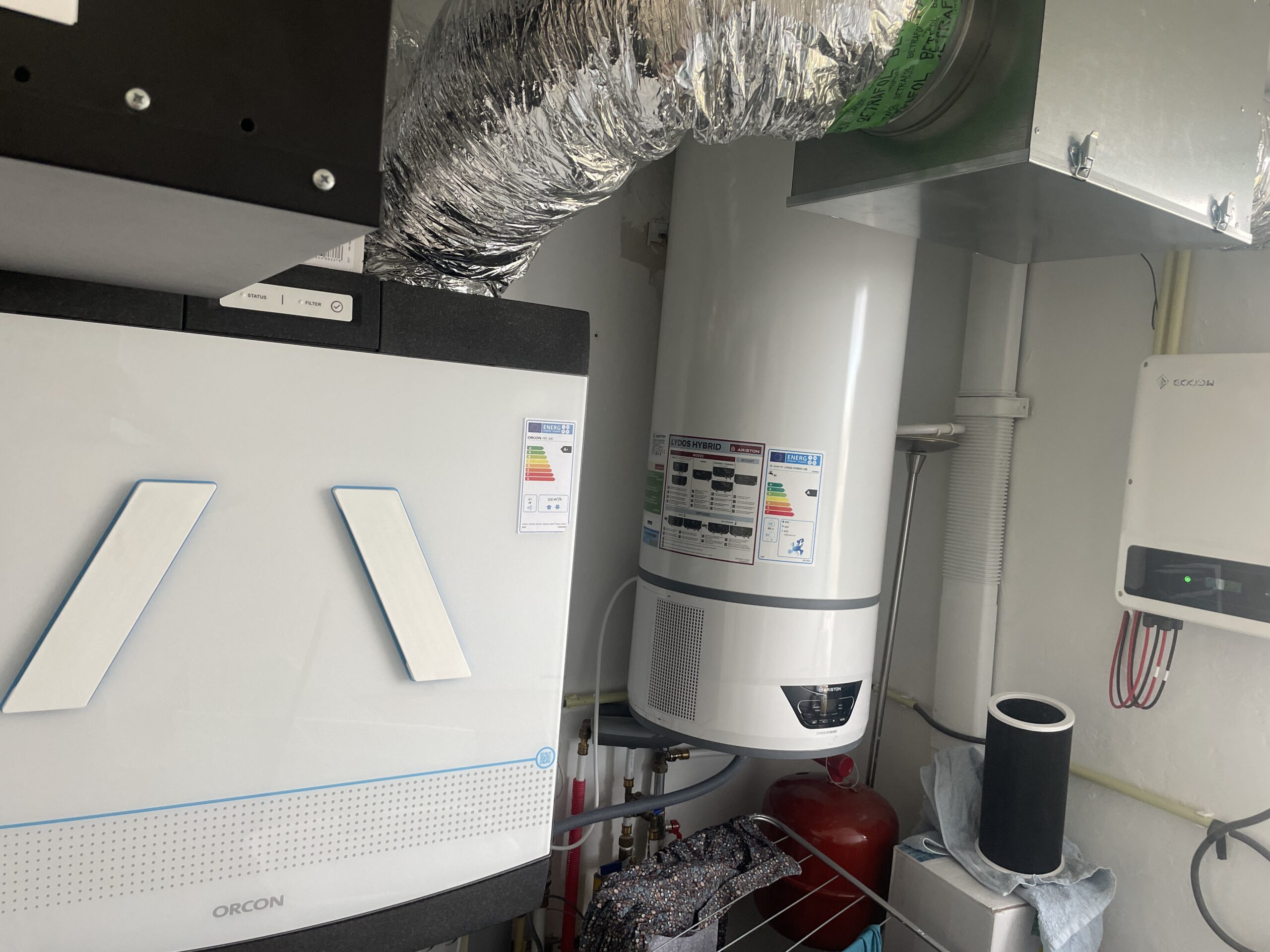 Panasonic 5kW monoblock warmtepomp, 100L Warmtepompboiler met binnenlucht (geen buis naar buiten) doucheWTW, besparende douchekop. Zonnepanelen, 2 installaties (6 zuid, 8 oost, 8 west)