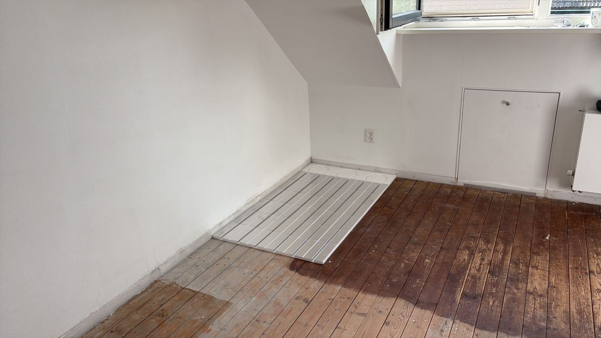 In 2025 hebben we op de zolder en het kantoortje op de 1e verdieping droogbouw-vloerverwarming op de houten vloeren aangelegd. Dit past goed bij de laag-temperatuurverwarming met de warmtepomp, en verhoogt het comfort in deze ruimten
