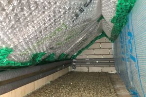 Het is een hele klus om de isolatieplaten in de kruipruimte te bevestigen. We hebben de platen met een tussenruimte van ongeveer een centimeter van elkaar met steuntjes tegen de vloer geduwd. Vervolgens met een PUR-pistool door de naden de platen tegen de vloer aan gelijmd met PUR.