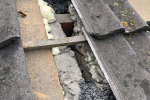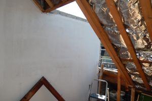 Op de aansluiting tussen de zoldervloer en het dak zitten naden (boven de muurplaat, rechter foto). Deze naden hebben we dichtgezet met isolatie en netjes afgewerkt.
