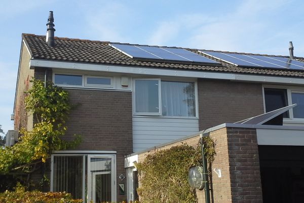 Bij ons hoekhuis is spouwmuurisolatie van de koude zijmuur niet mogelijk. Muren van de begane grond zijn deels vervangen door HR++ glas, wat enorm scheelt in isolatiewaarde t.o.v. de koude muren. Vanwege de natte kruipruimte hadden we al eerder gekozen voor een laag schelpen in de kruipruimte, waardoor de schimmel in huis passé was. Bij de renovatie werd de koude parketvloer van de benedenverdieping vervangen door een tegelvloer in combinatie met lage temperatuur vloerverwarming en een lucht-water warmtepomp. De elektrische energie voor de warmtepomp en meer wordt geleverd door de 18 zonnepanelen. Alleen op dagdelen dat de temperatuur onder de 6 graden zakt en we het binnen warmer willen hebben, moeten we aanvullende elektrische straal- of convectorkacheltjes aanzetten of de cv-gasketel bijschakelen.