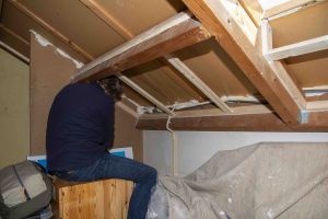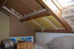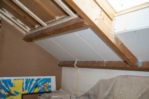*Na-isoleren was in ons geval erg makkelijk, We hebben een frame gemaakt tussen de draagbalken en deze vol gestopt met glaswol. Daarna hebben we het frame lucht dicht gemaakt met dampwerendefolie. Deze folie heeft een voor en achterkant, die ervoor zorgt dat er geen vocht in kan, maar wel eruit. Vervolgens hebben wij het frame weer afgewerkt met gipsplaten. Gips werkt heel makkelijk en alle scheurtjes en gaten kunnen makkelijk dicht gesmeerd worden. De randen hebben we gekit voor een nette afwerking.Als laatste hebben we alles geverfd.