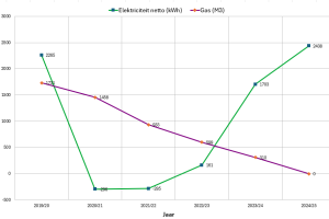*Op de grafiek energieverbruik is een dalende lijn in het gasverbruik te zien sinds 2020/2021 dit komt voor een groot deel door het isoleren van het dak, De warmtepompboiler en HR++ glas hebben wij bij intrek gelijk laten doen. De vloer-, spouwmuur- en gevelisolatie hebben wij pas in en na 2022 laten doen.