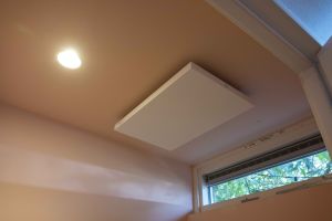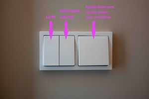 Omdat in de wc maar een heel klein lusje van de vloerverwarming zit wordt de wc in de winter niet warm genoeg. Ondanks dat je doorgaans niet lang verblijft in de kleinste ruimte van het huis wilden wij voor de iets langere bezoekjes toch graag iets meer comfort. Om dit snel te bereiken hebben wij een infraroodpaneel van 100Watt geïnstalleerd op het plafond.