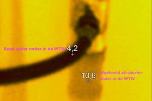 De WTW is dubbelwandig en werkt volgens het tegenstroom principe. Koud tapwater komt onder in de buis in de buitenste schil binnen en wordt omhoog gedrukt, Terwijl warm afvalwater van het douchen door de binnenste schil van boven naar beneden stroomt. Op de foto’s is te zien wat voor een effect dit heeft op de temperatuur van de verschillende stromen.