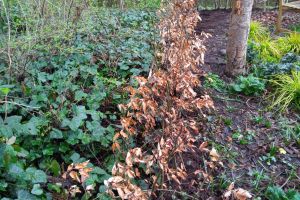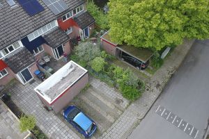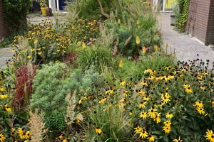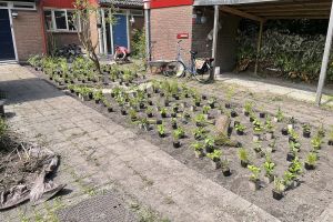 Achter hebben wij meer dan 500 tegels en klinkers plus een schuurtje verwijderd. Dit is vervangen door groene borders en een klein grasveldje. Voor hebben wij alles gerooid twee rijen van de oprit afgesnoept en hier samen met de buren nieuwe beplanting in gezet met veel inheemse soorten (en een paar mooie bollen). De schutting achter met de buren hebben we vervangen voor een duurzame schutting (die niet geïmpregneerd is) van de buurjongens. Op de andere grenzen van de tuin hebben we een beuken haag (Fagus Sylvatica) geplant. Naast het huis hebben we de erfscheiding middels een houtwal. Op het dak van de schuur hebben we een groendak aangelegd. In de toekomst willen we de carport vernieuwen en ook bedekken met begroeiing.
