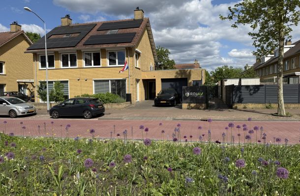 In 2023 nog uitgebreid met 7 panelen (3.2kWp) op de gevel op het zuiden.