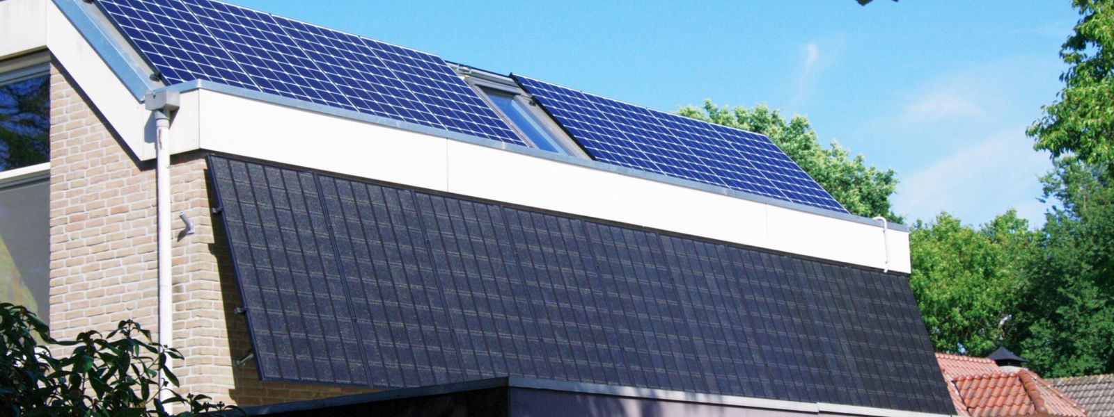 Elektra opgewekt door 8 PVT en 23 gewone PV-panelen op schuin en plat dak en aan gevel.