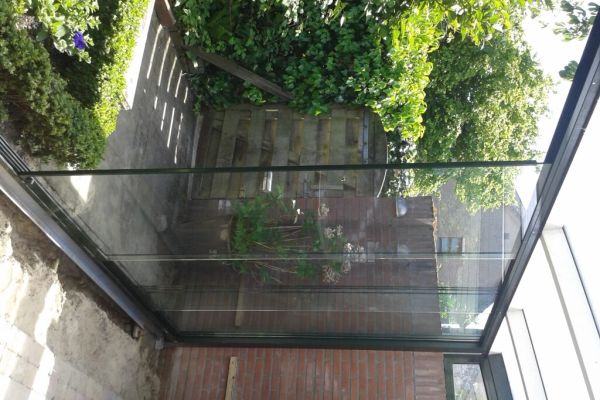 Stap 6: Open veranda afgesloten met hardglazen schuifdeuren (2015). Geeft Warmtebuffer: In de koude jaargetijden blijkt de veranda met gesloten deuren een enorme isolatie / warmtebuffer te worden, waarmee alternatief de benedenverdieping verwarmd wordt. Uiteraard is daar wel de zon voor nodig… NB: Er zijn diverse bedrijven die oude, bestaande veranda’s – op maat – van glazen deuren kunnen voorzien. Denk wel aan fundering van de drempel-rails, die beslist niet mag wegzakken in de loop van de tijd.